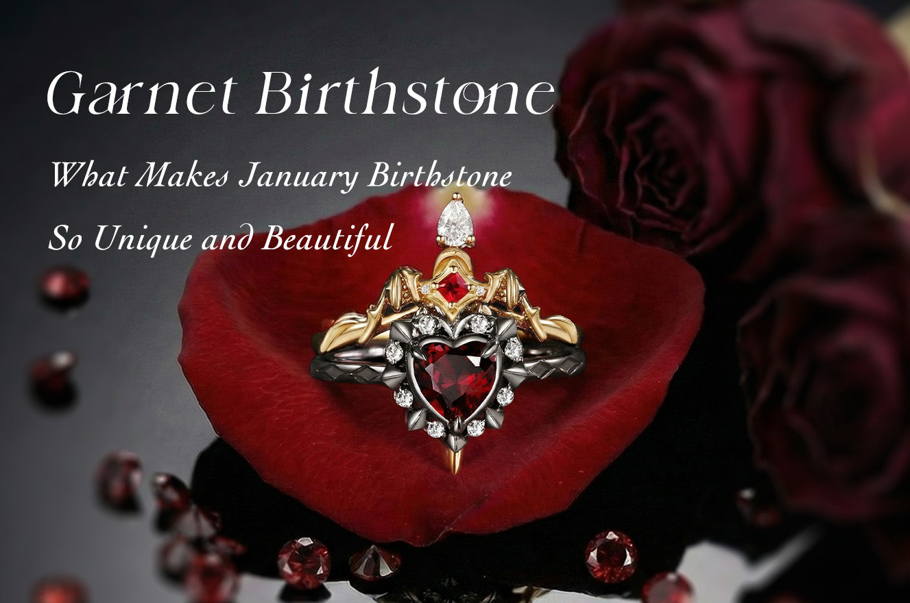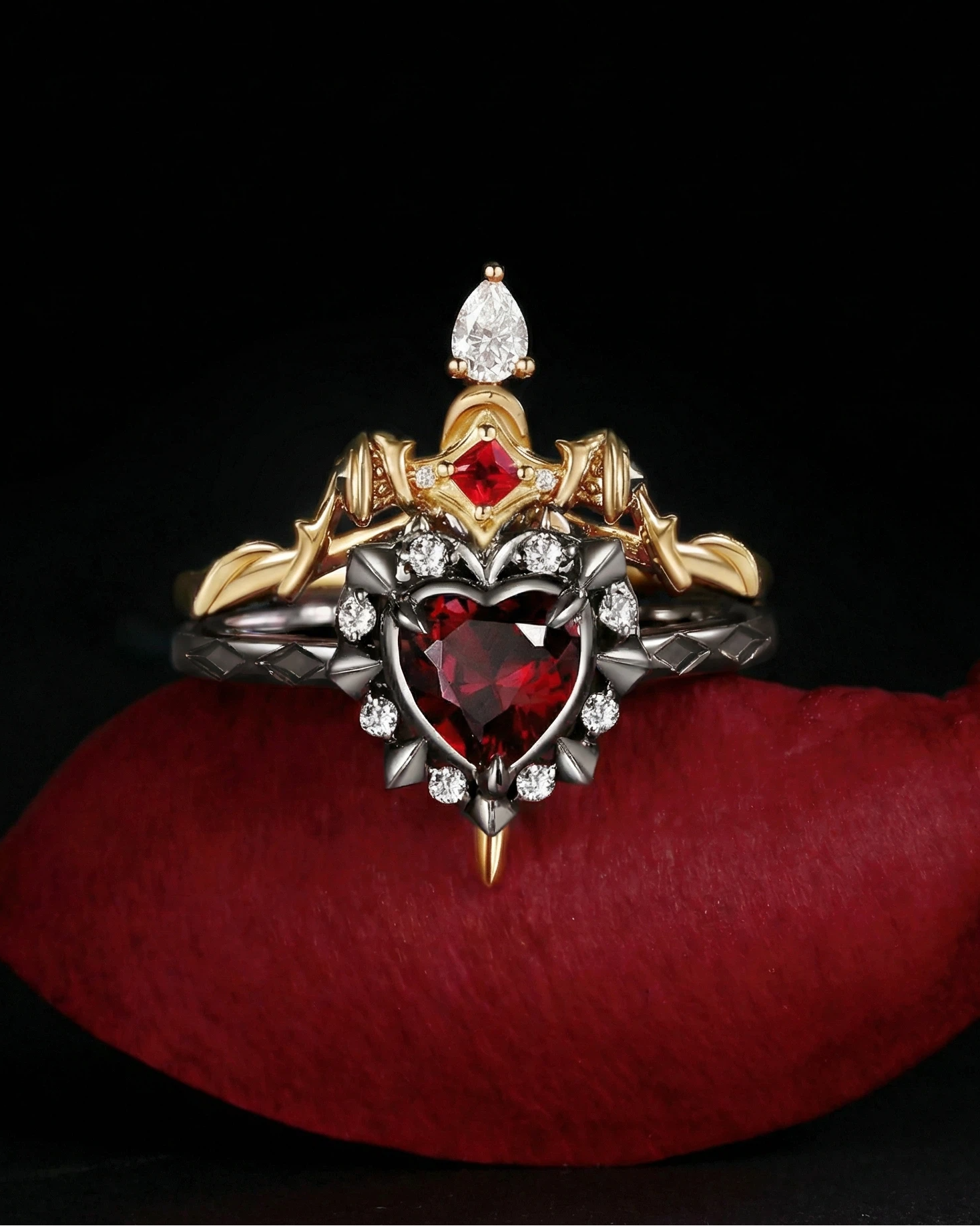 Unique Heart Shaped Garnet Sword Ring Bridal Set 2pcs - Cupid's Arrow