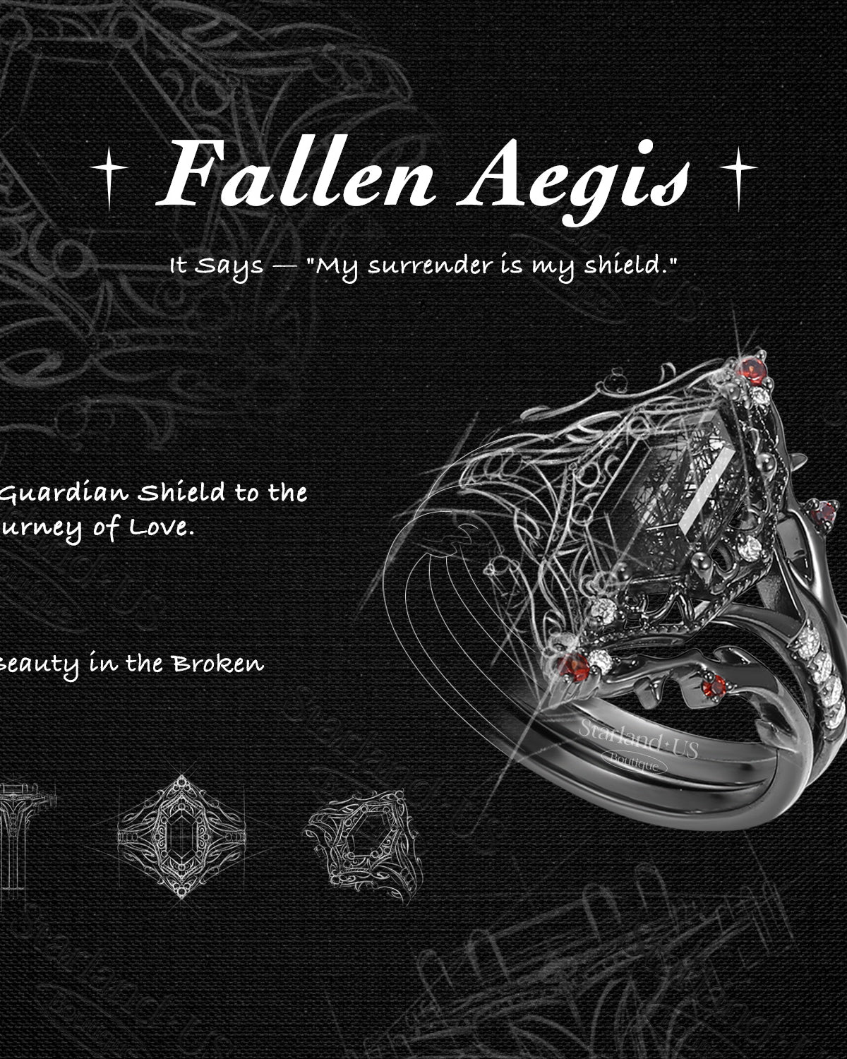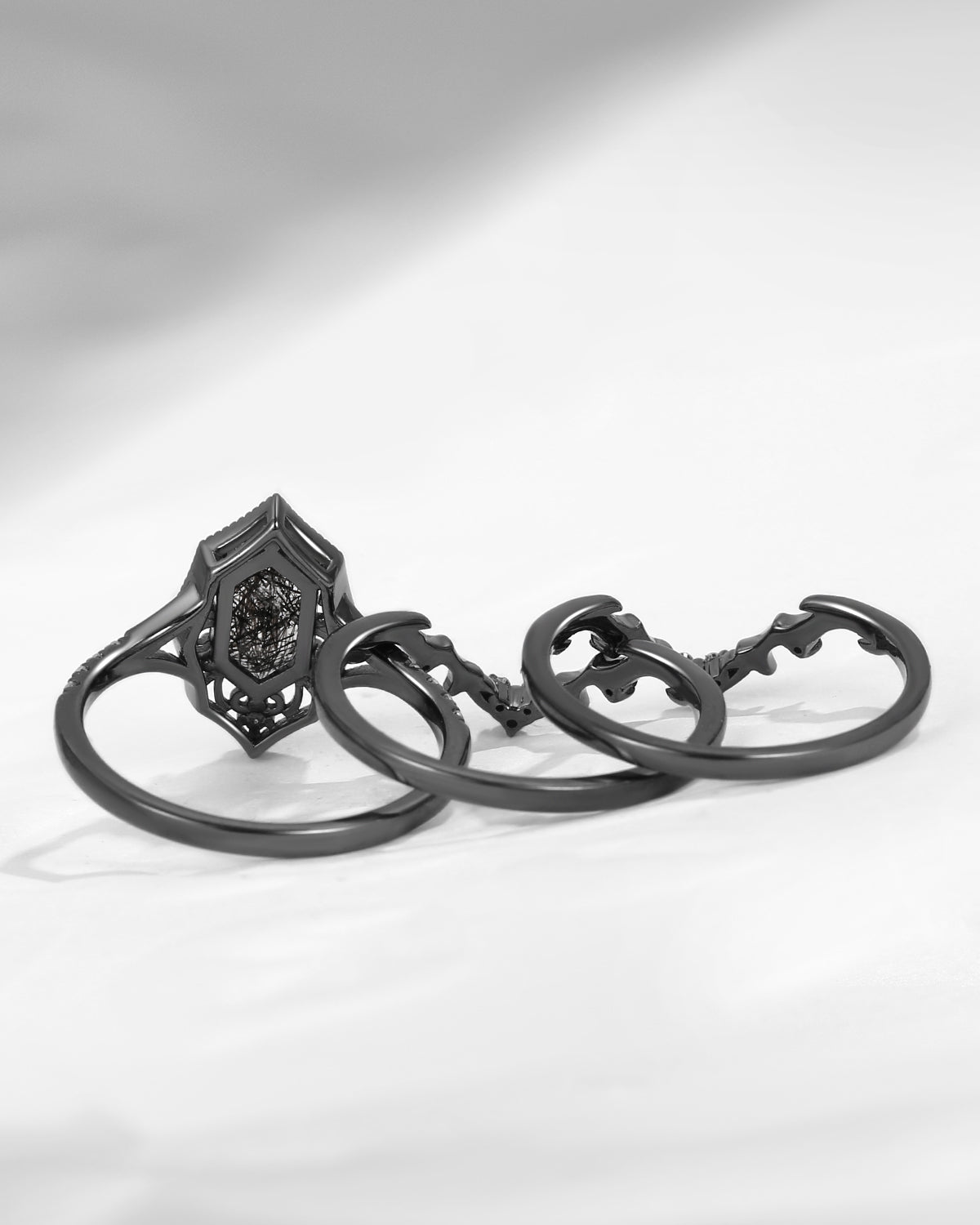 Gothic Inspired Hexagon Cut Black Rutilated Quartz 'Fallen Aegis' Shield Engagement Ring Set 3pcs
