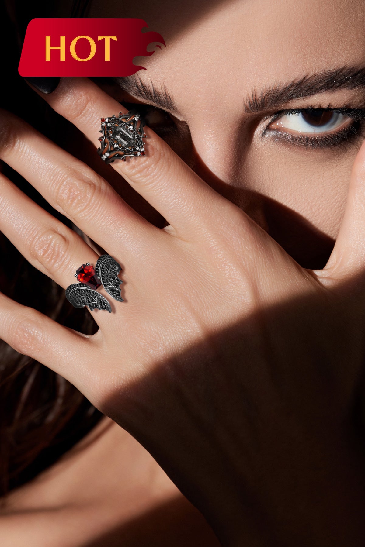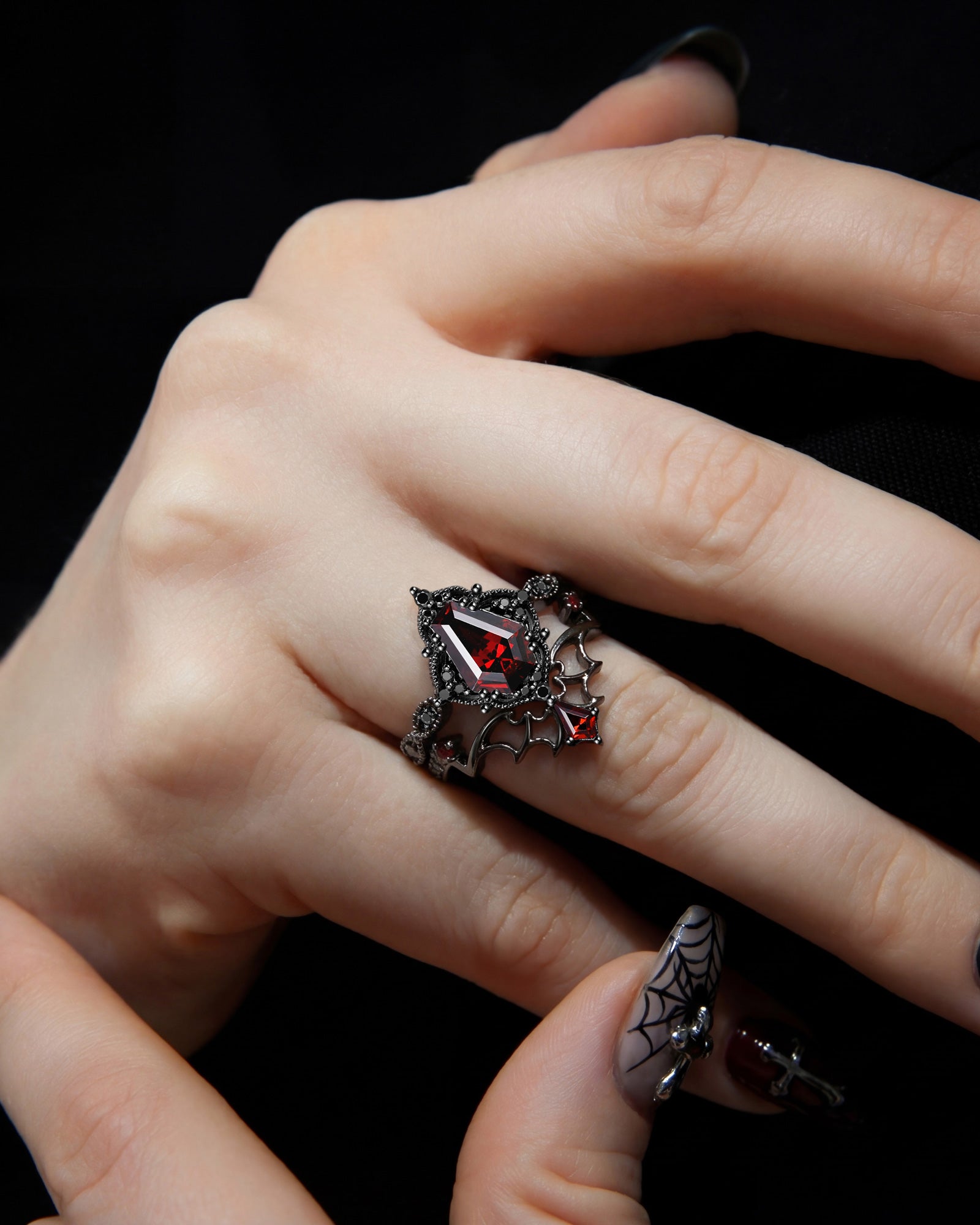 Kite Cut Garnet Bat Wing Inspired Thorns Engagement Ring Set 2pcs - Bat Ring