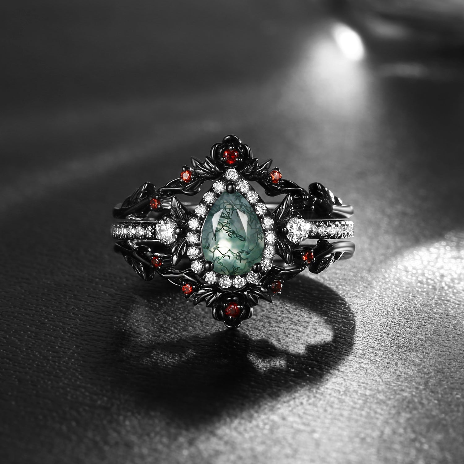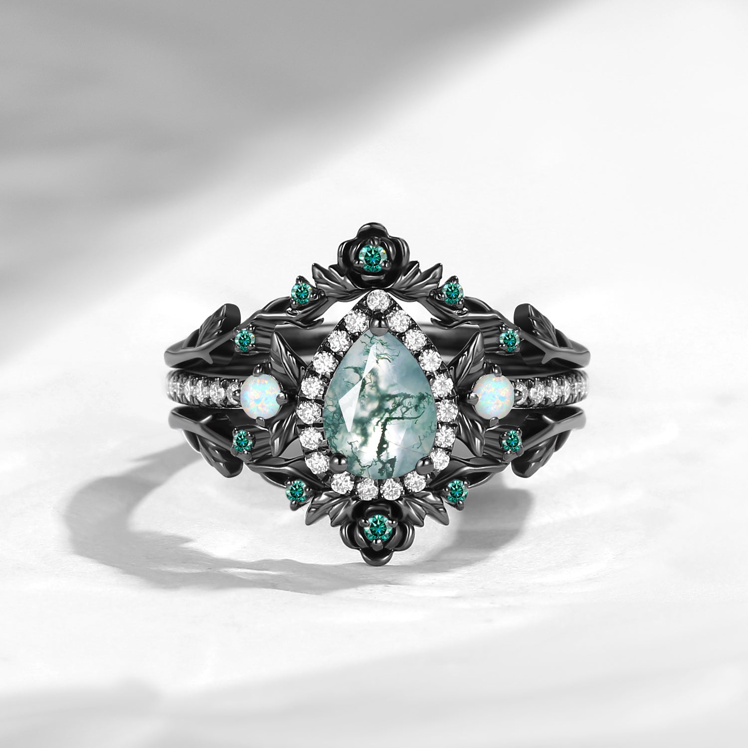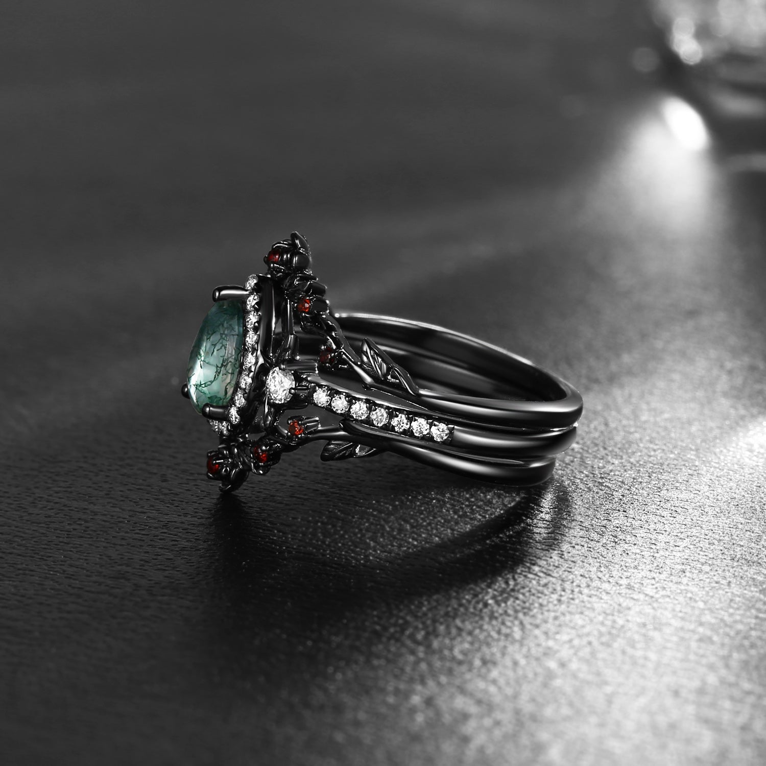 Celtic Moon | Pear Cut Moss Agate Gothic Inspired Snake Engagement Ring Set 2pcs