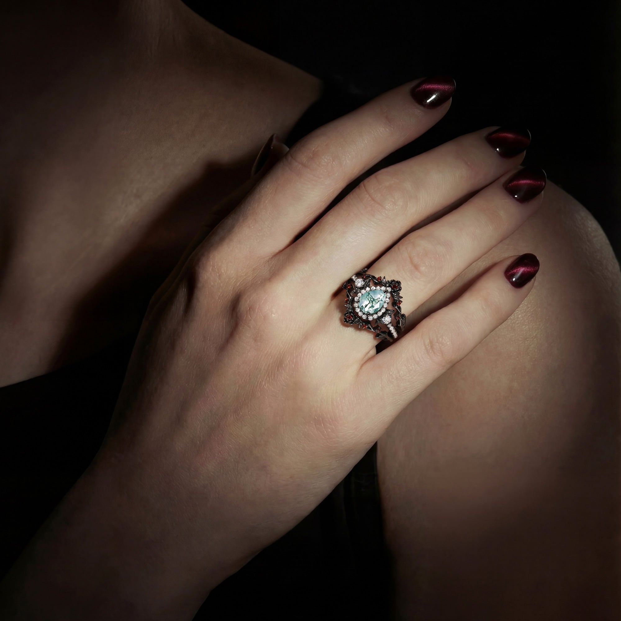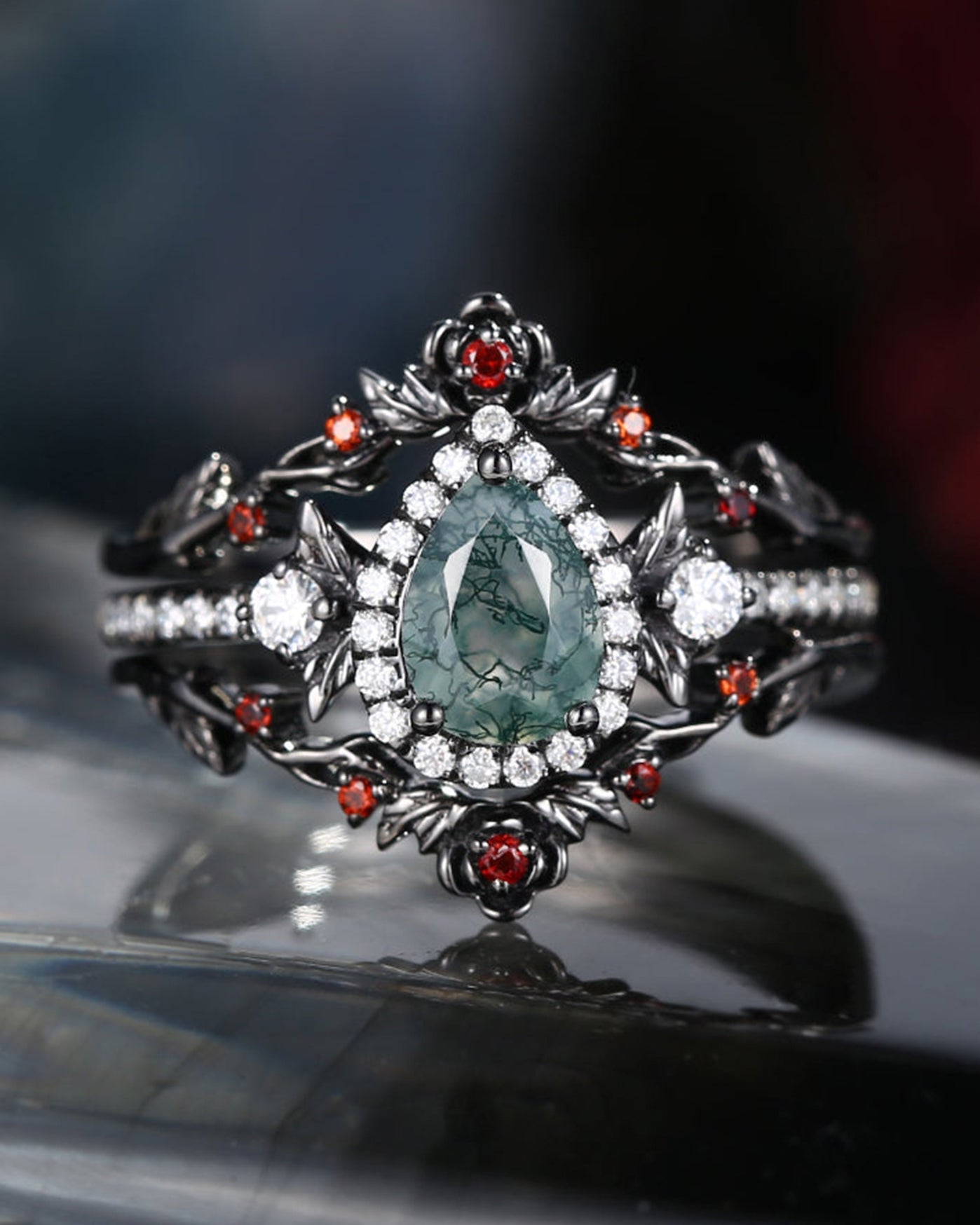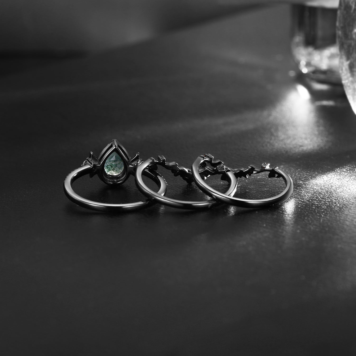 Celtic Moon | Pear Cut Moss Agate Gothic Inspired Snake Engagement Ring Set 2pcs