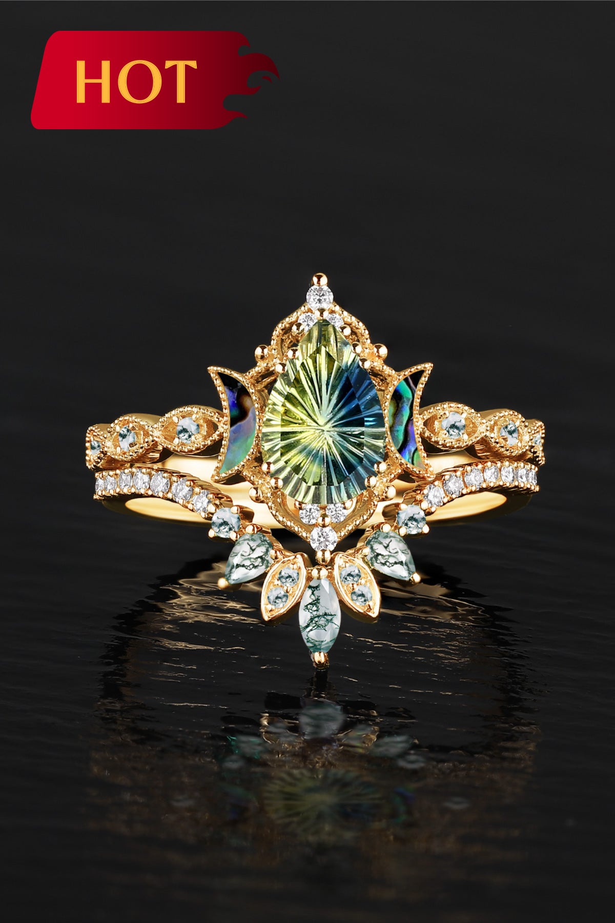 Crescent Moon | Pear Cut Moss Agate 'Ultra Galaxy' Engagement Ring Set 2pcs