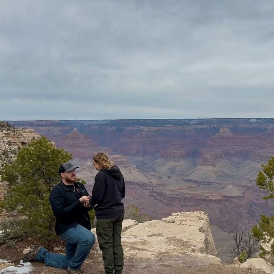 We are Mab and Taylor, we’ve been together for 5 years now. He asked me to be his girlfriend while we were on our first ever trip together at the little grand canyon (Providence canyon state park). This year we went on a trip to Arizona for hiking / vacation and he finally proposed while we were at the Grand Canyon National Park! Truly a magical experience i couldn’t be more grateful! We thank your company for helping him get a custom ring set made for me as well engraved!