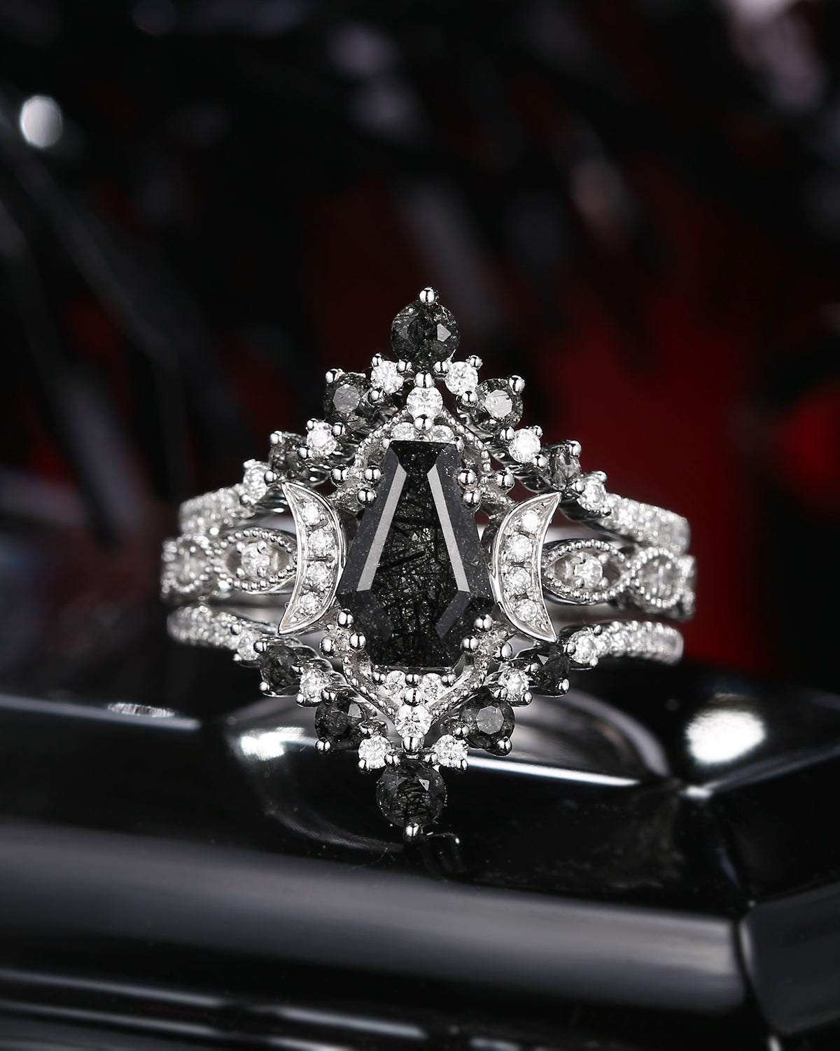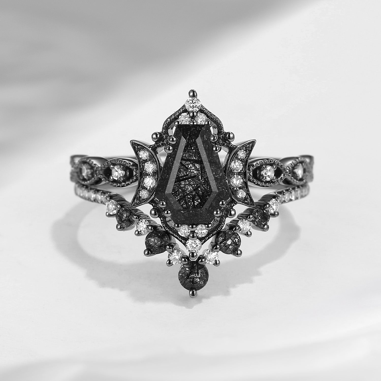 Crescent Moon | Coffin Cut Black Rutilated Quartz 'Till Death Do Us Part' Ring Set 2pcs