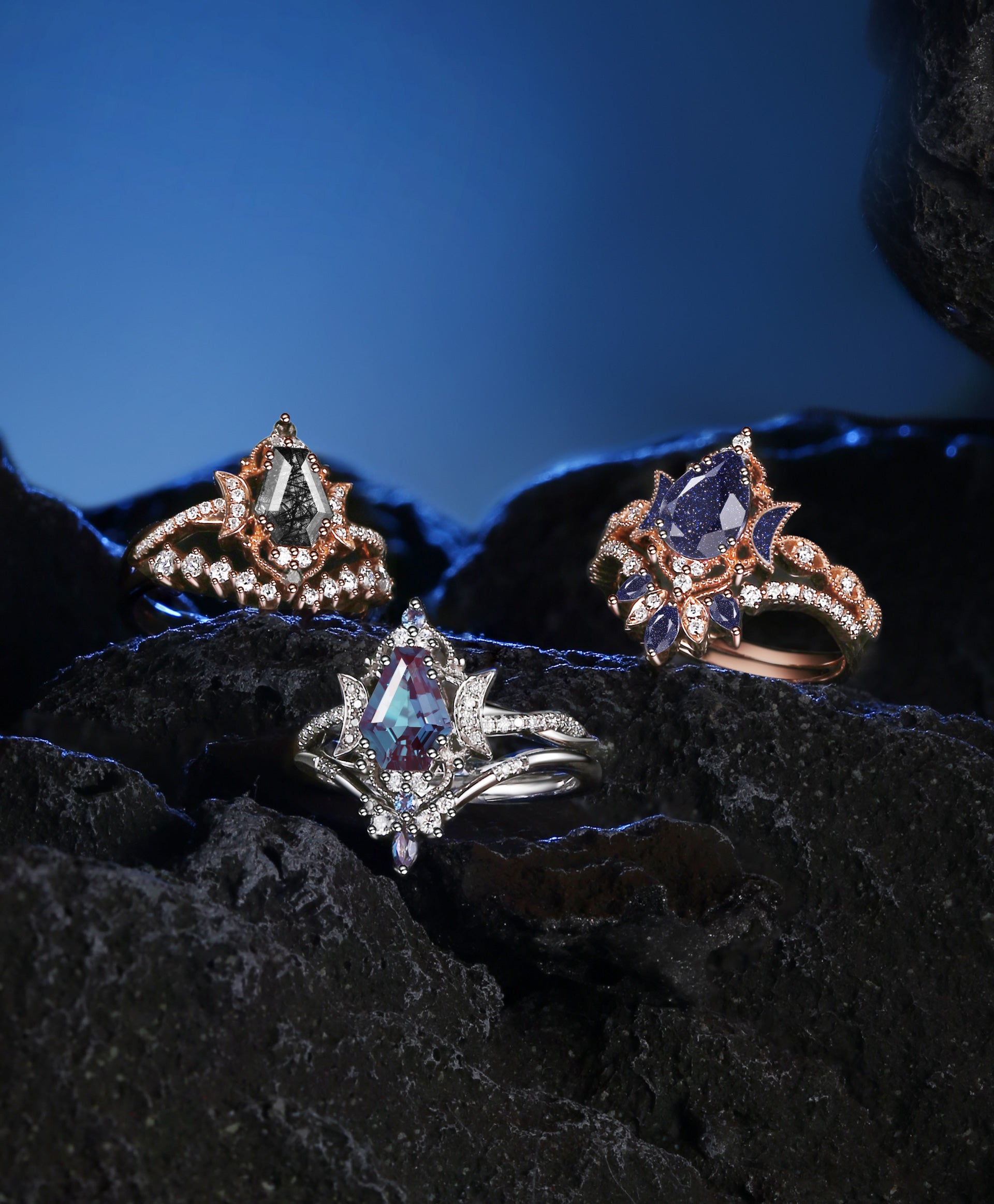 Crescent Moon | Unique Lab Alexandrite Engagement Ring Set 2pcs - Full Moon