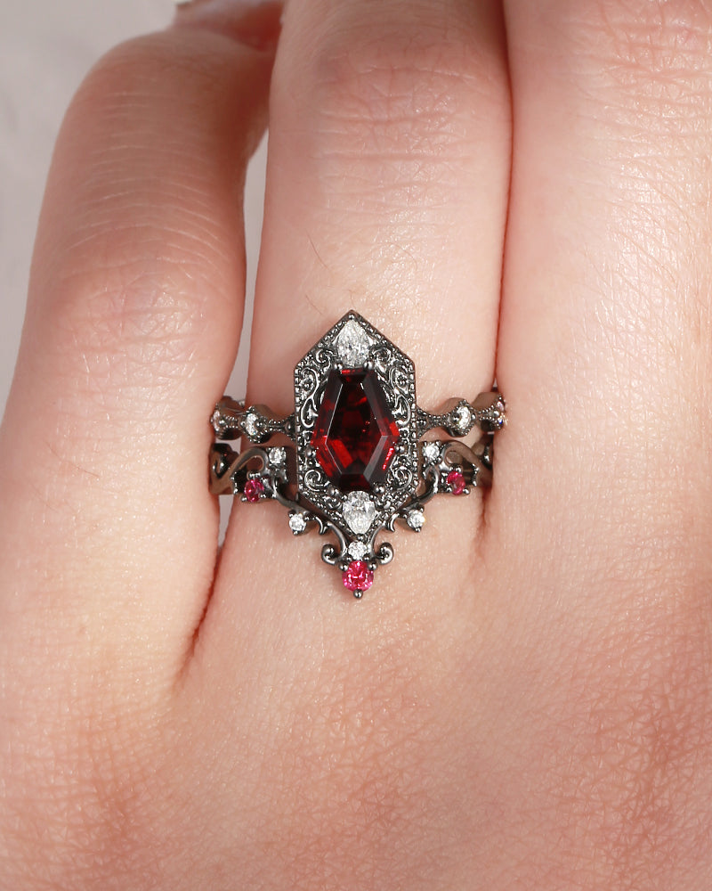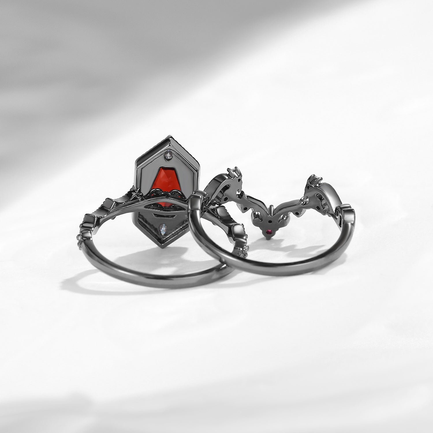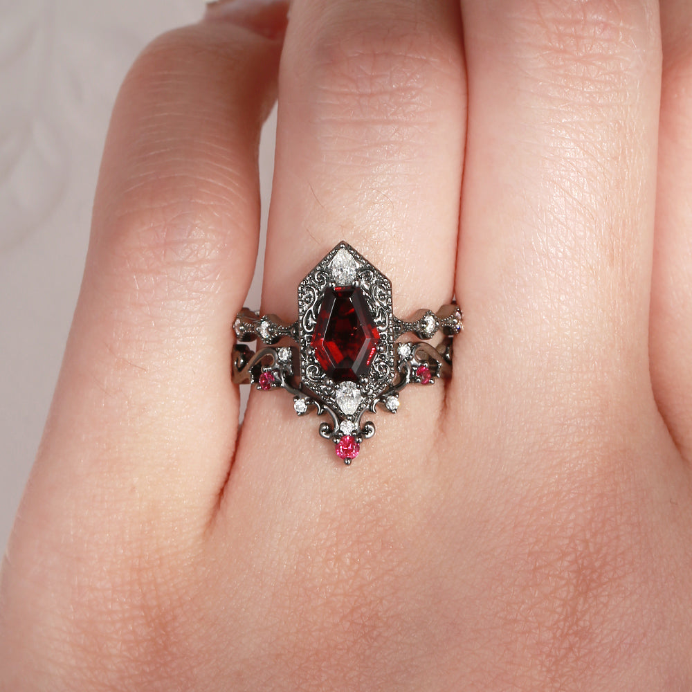 Gothic Inspired Hexagon Cut Garnet Vampire Shield Engagement Ring Set 3pcs