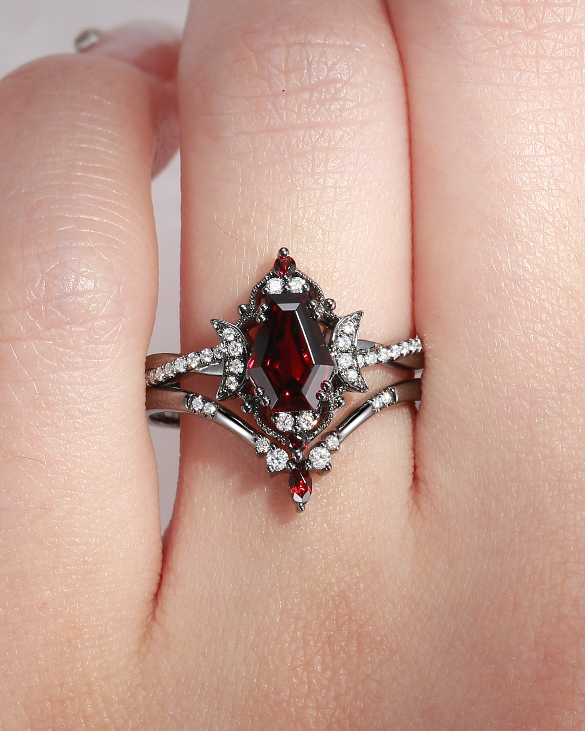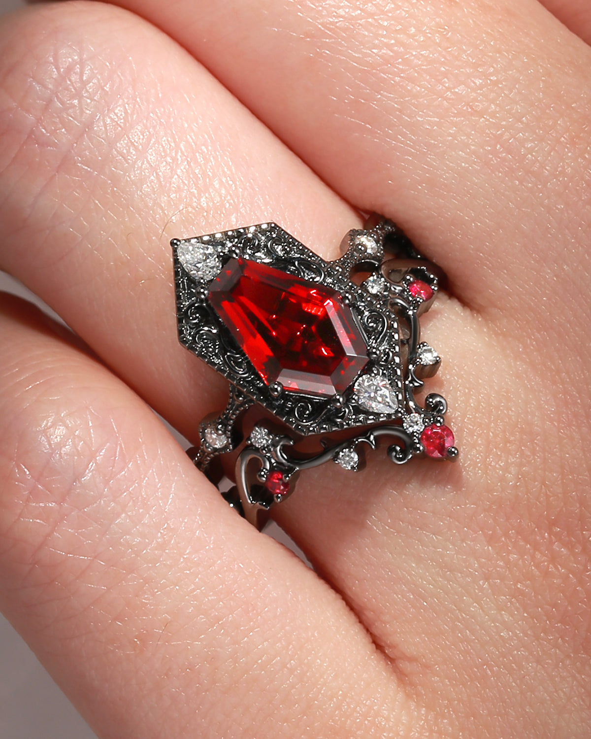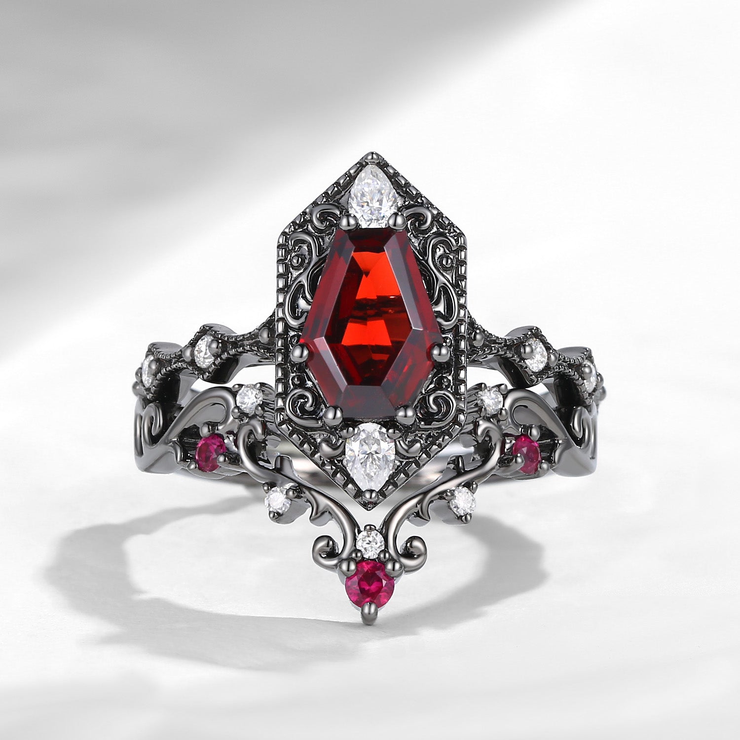 Gothic Inspired Hexagon Cut Garnet Vampire Shield Engagement Ring Set 3pcs