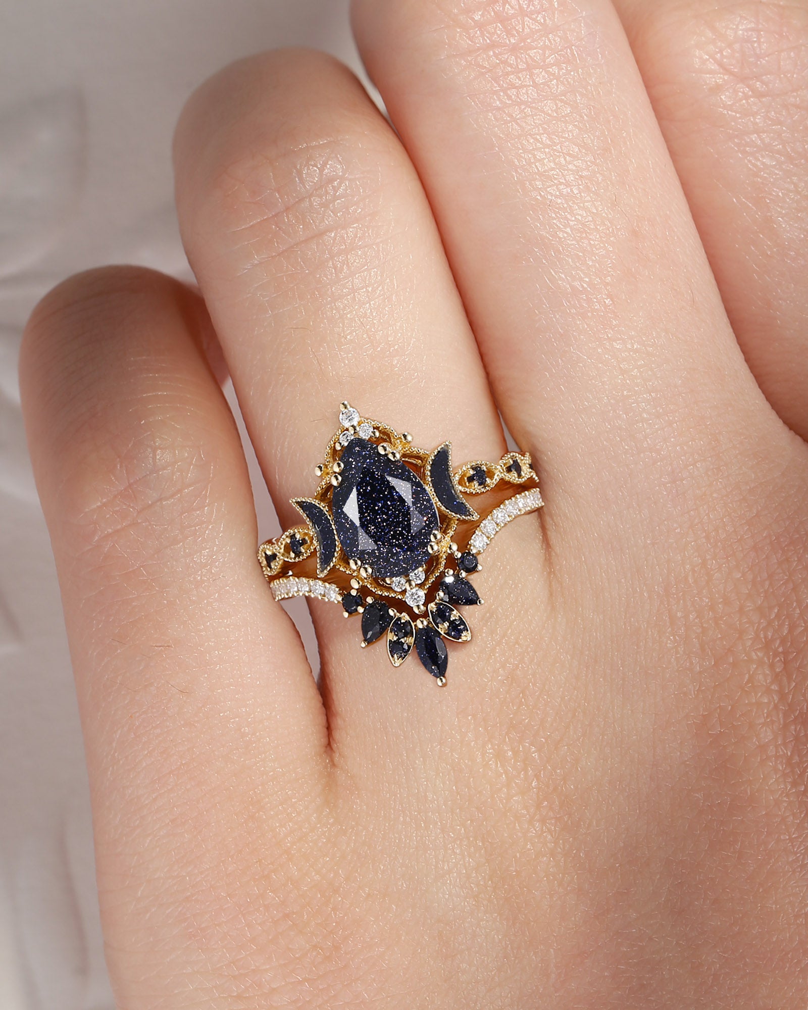 Crescent Moon | Pear Cut Blue Sandstone 'Ultra Galaxy' Engagement Ring Set 2pcs