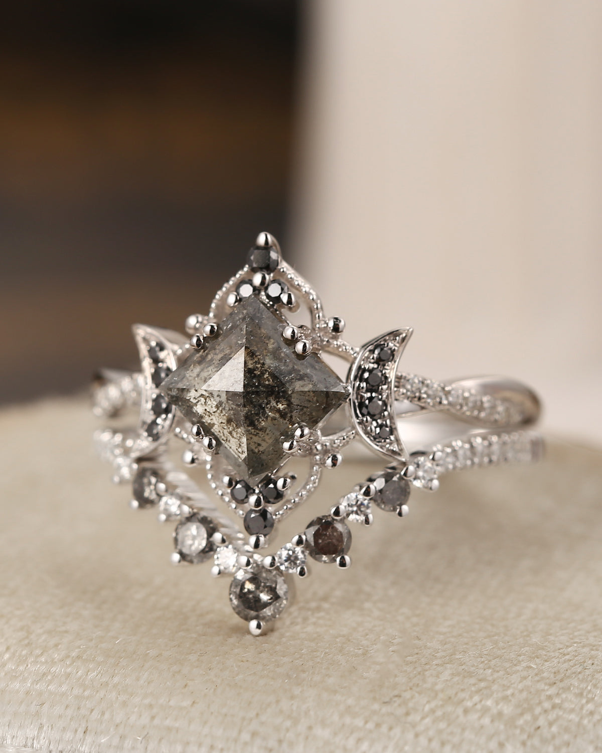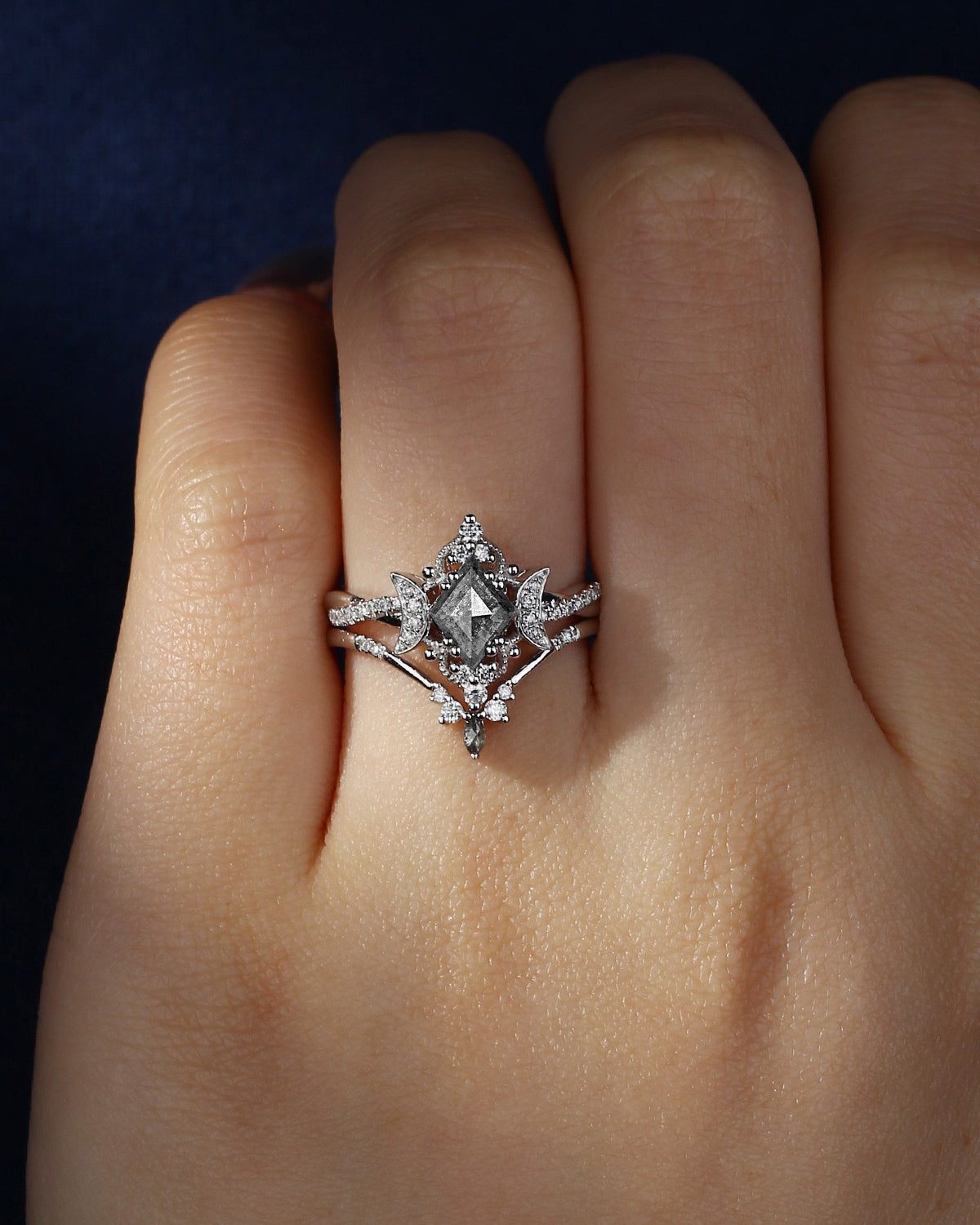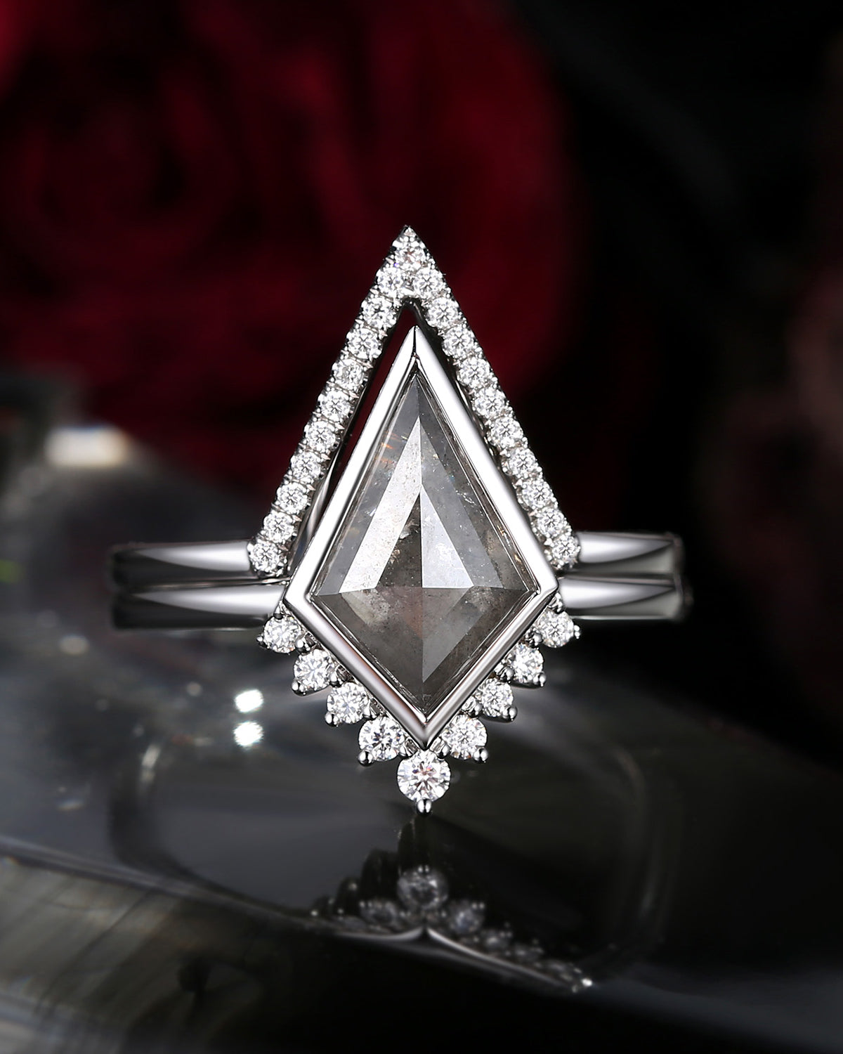 Unique Kite Cut Salt And Pepper Engagement Ring 2pcs
