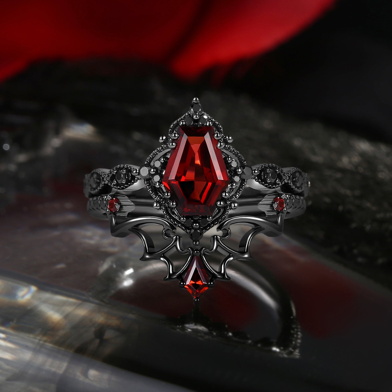 Coffin Cut Garnet Vintage Black Gold Bridal Set 2pcs - Bat Ring