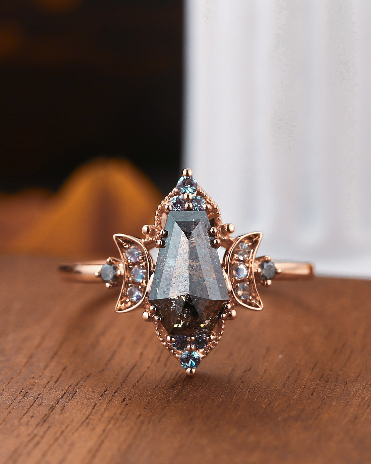 Crescent Moon | Kite Shaped Art Deco Lab Alexandrite Engagement Ring Set 2pcs