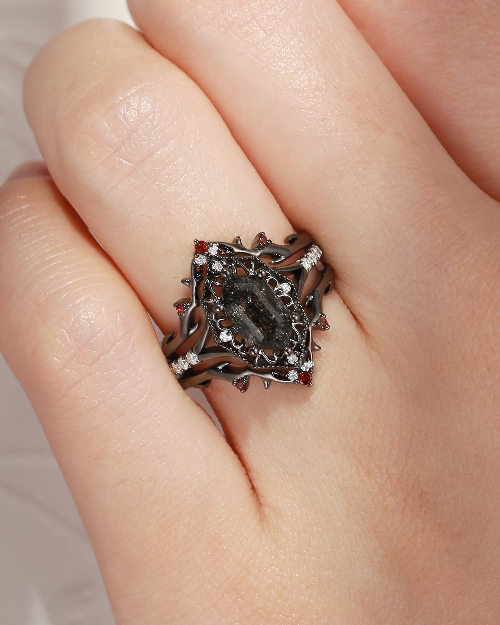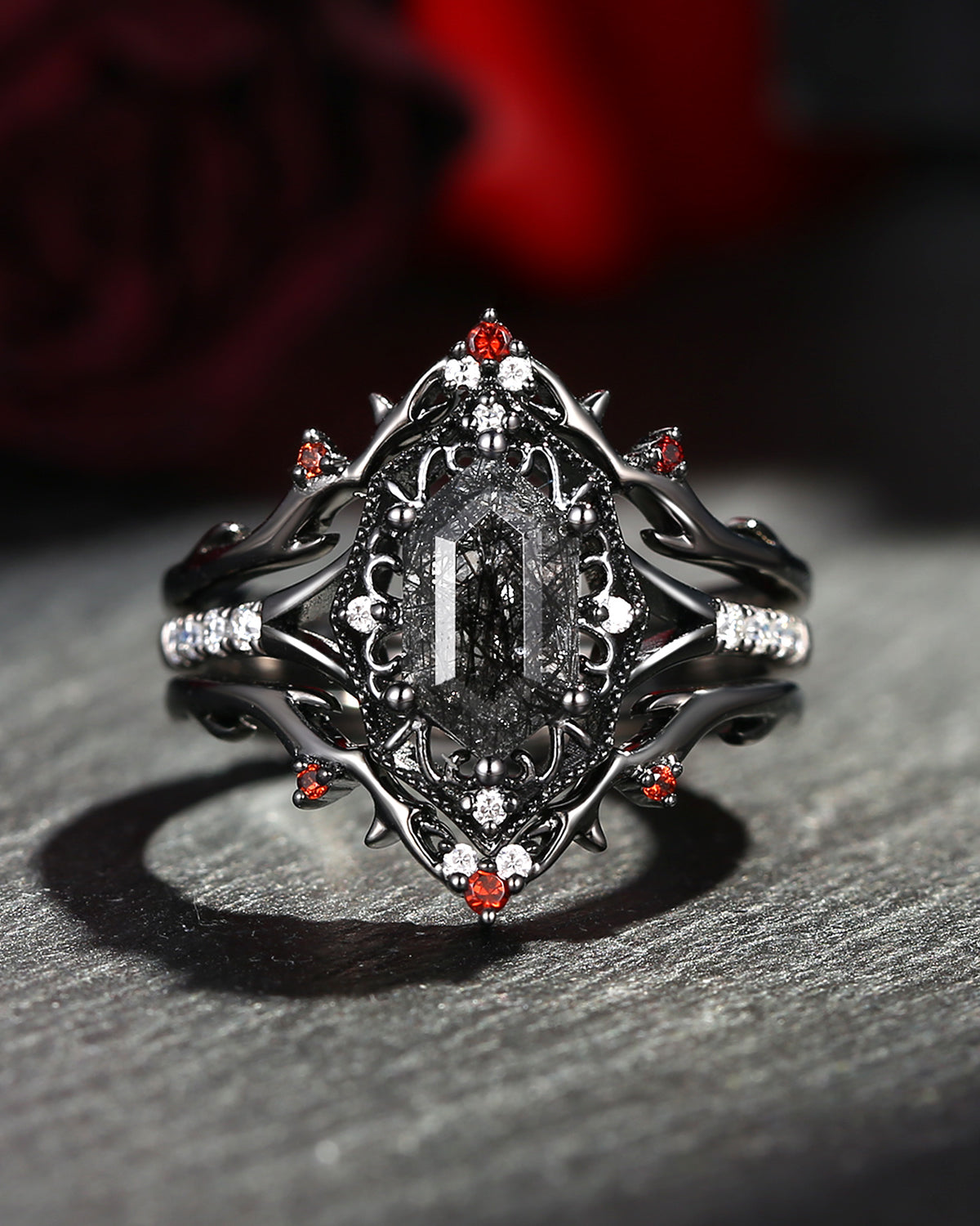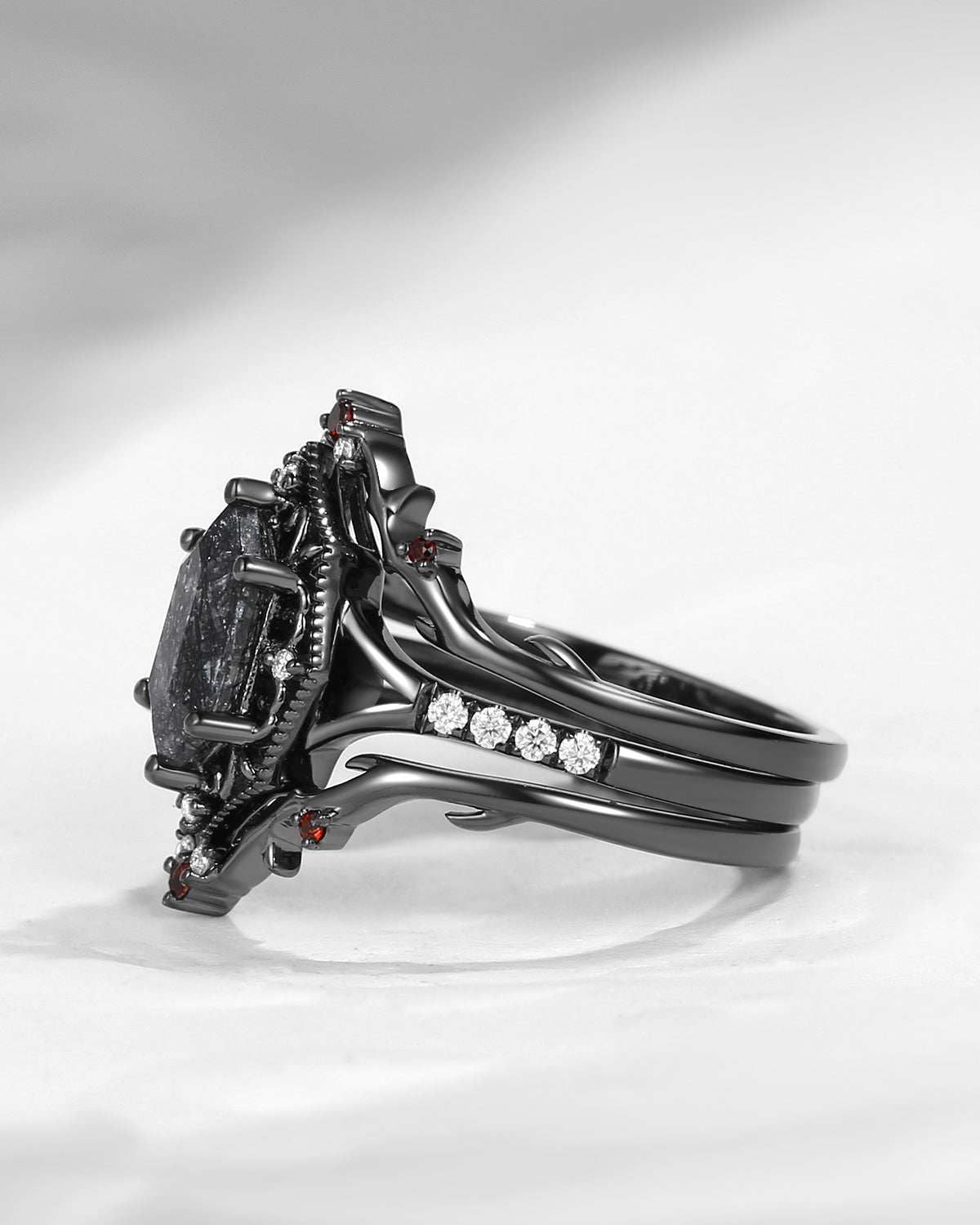 Cluster Coffin Black Rutilated Quartz Spider Web Engagement Ring Set 2pcs
