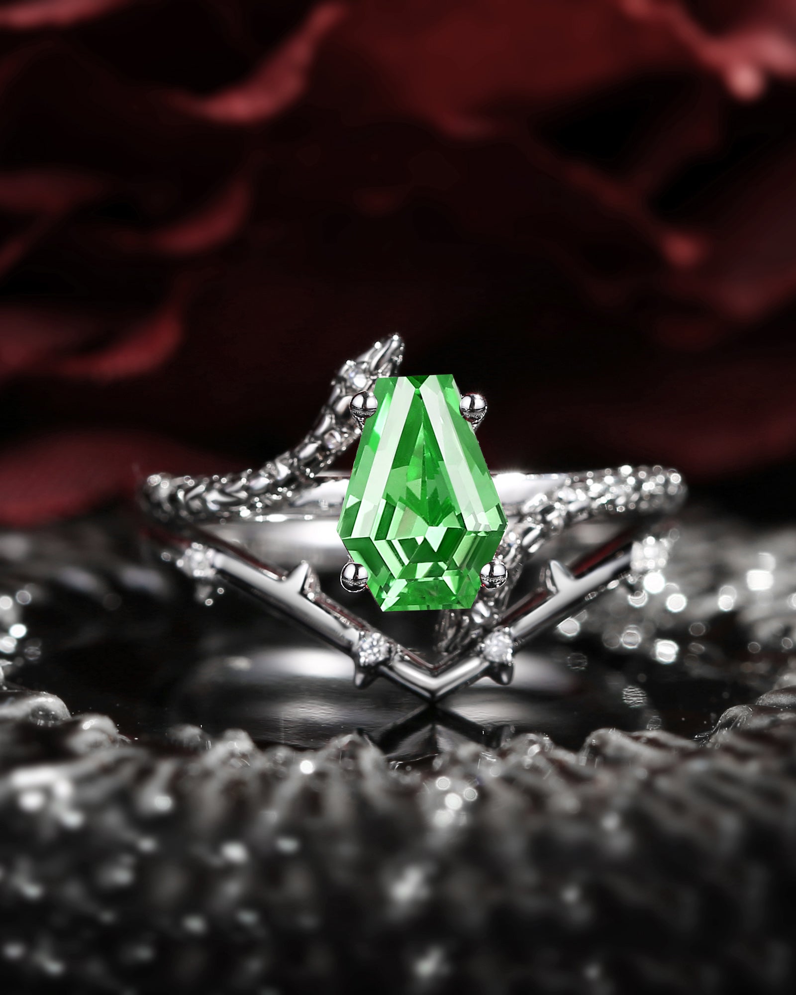 Gothic Bat Inspired Long Hexagon Cut Lab Emerald Engagement Ring Set 2pcs