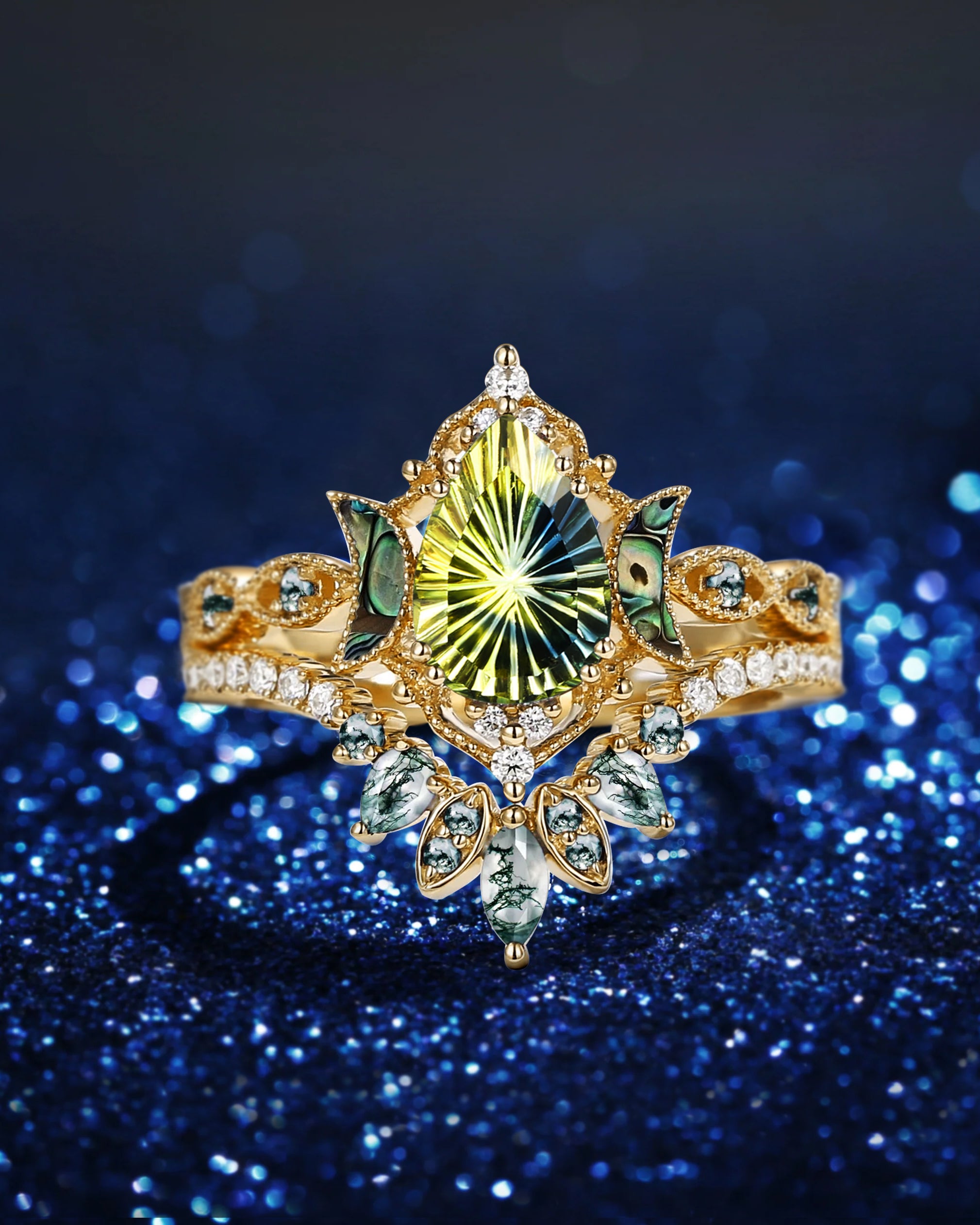 Crescent Moon | Pear Cut Peridot 'Ultra Galaxy' Engagement Ring Set 2pcs