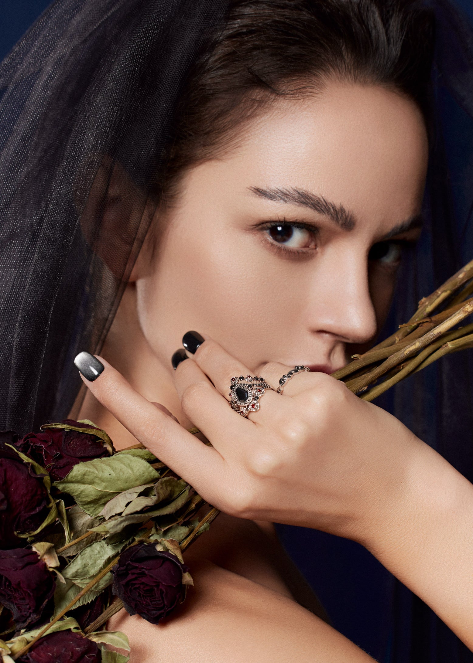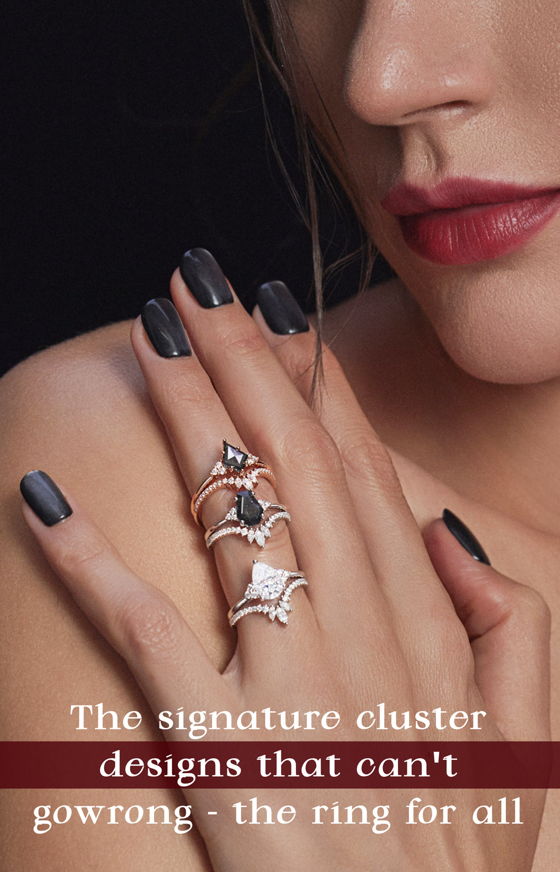 Crescent Moon | Vintage Inspired Pear Shaped Garnet Black Gold Ring Set 2pcs
