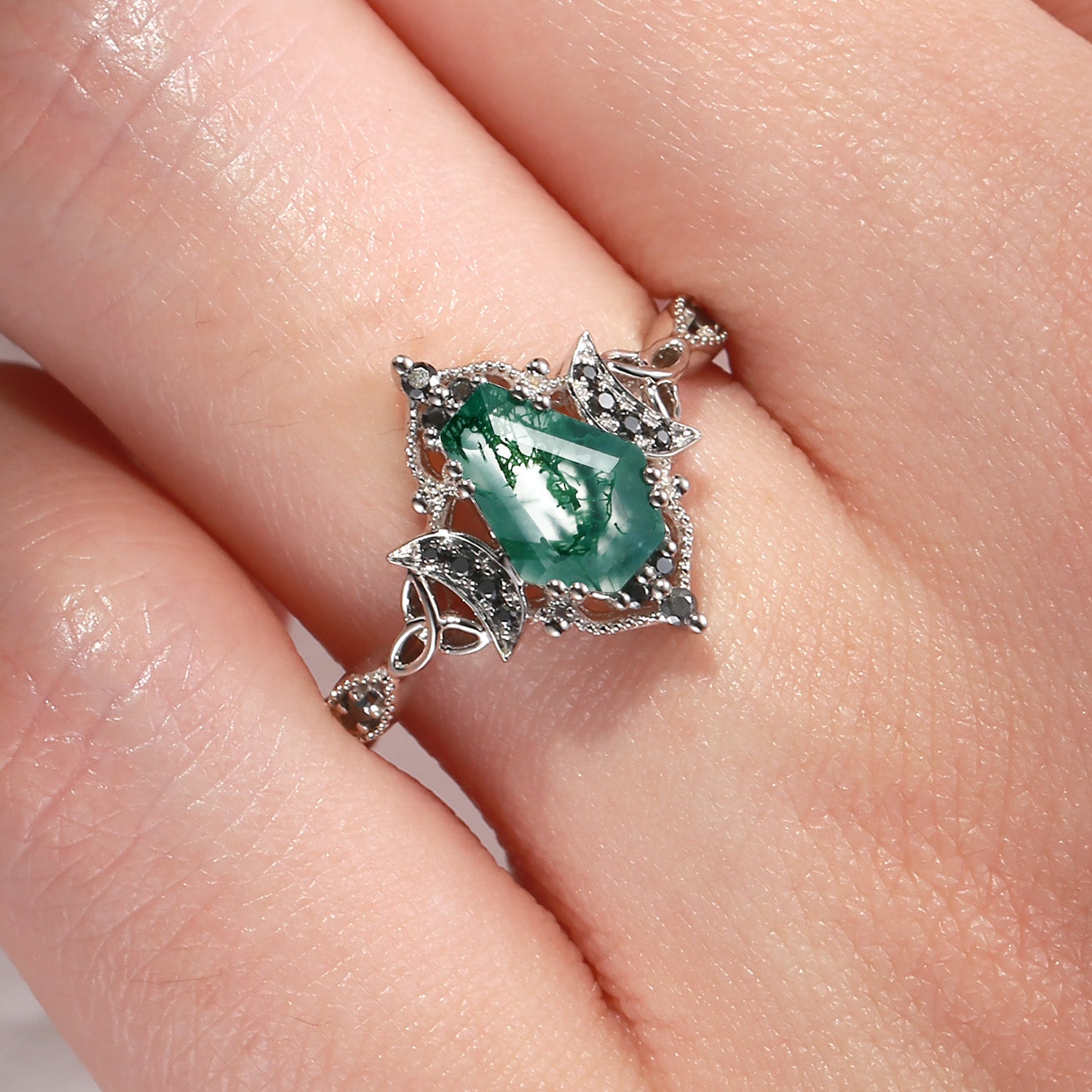 Half Moon Moss Agate + Coffin Cut Moissanite 'Tree of Life' Mushroom Engagement Ring Set 2pcs