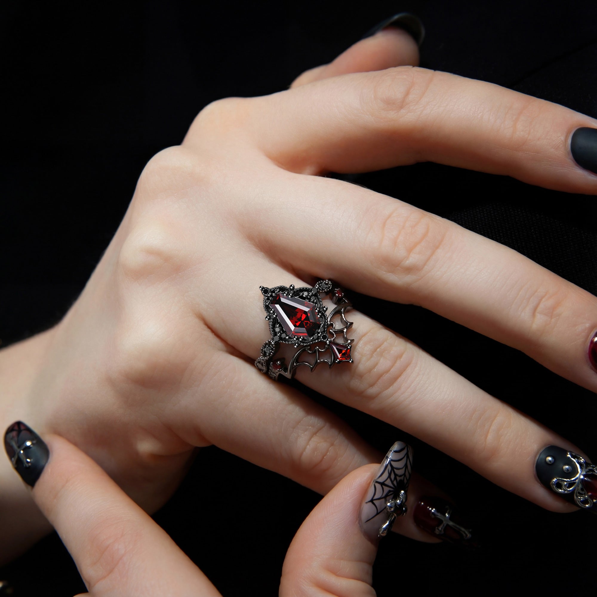 Coffin Cut Garnet Gothic Inspired Black Gold Engagement Ring - Bat Ring