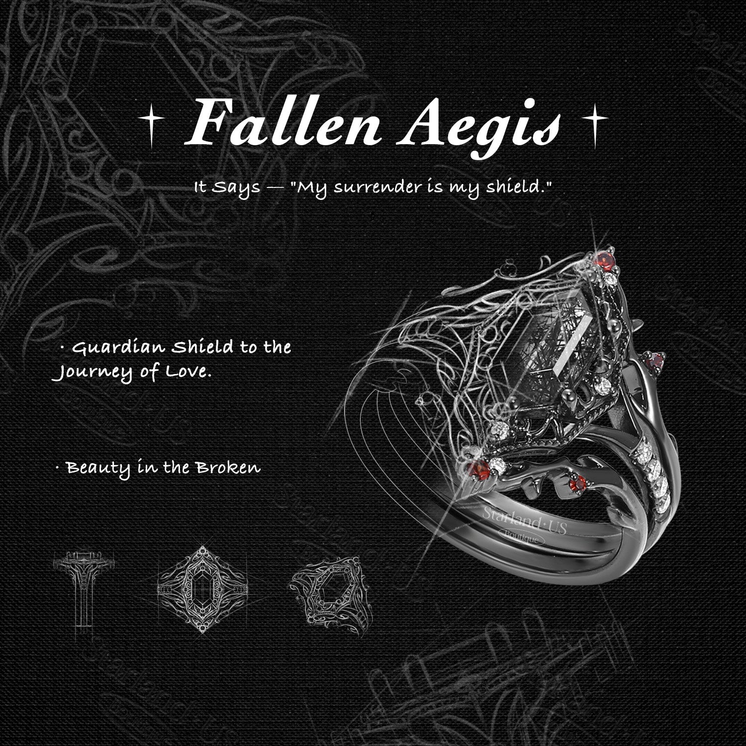 Emerald Cut 'Fallen Aegis' Gothic Engagement Ring Set 2pcs