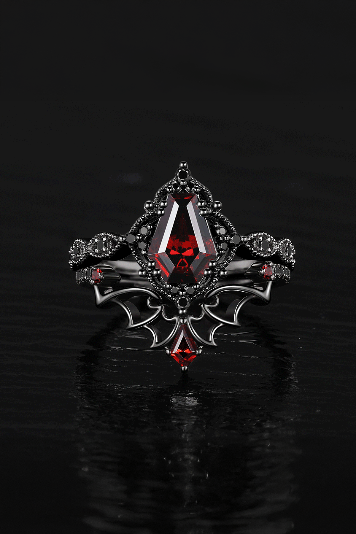 Kite Cut Garnet Bat Wing Inspired Thorns Engagement Ring Set 2pcs - Bat Ring
