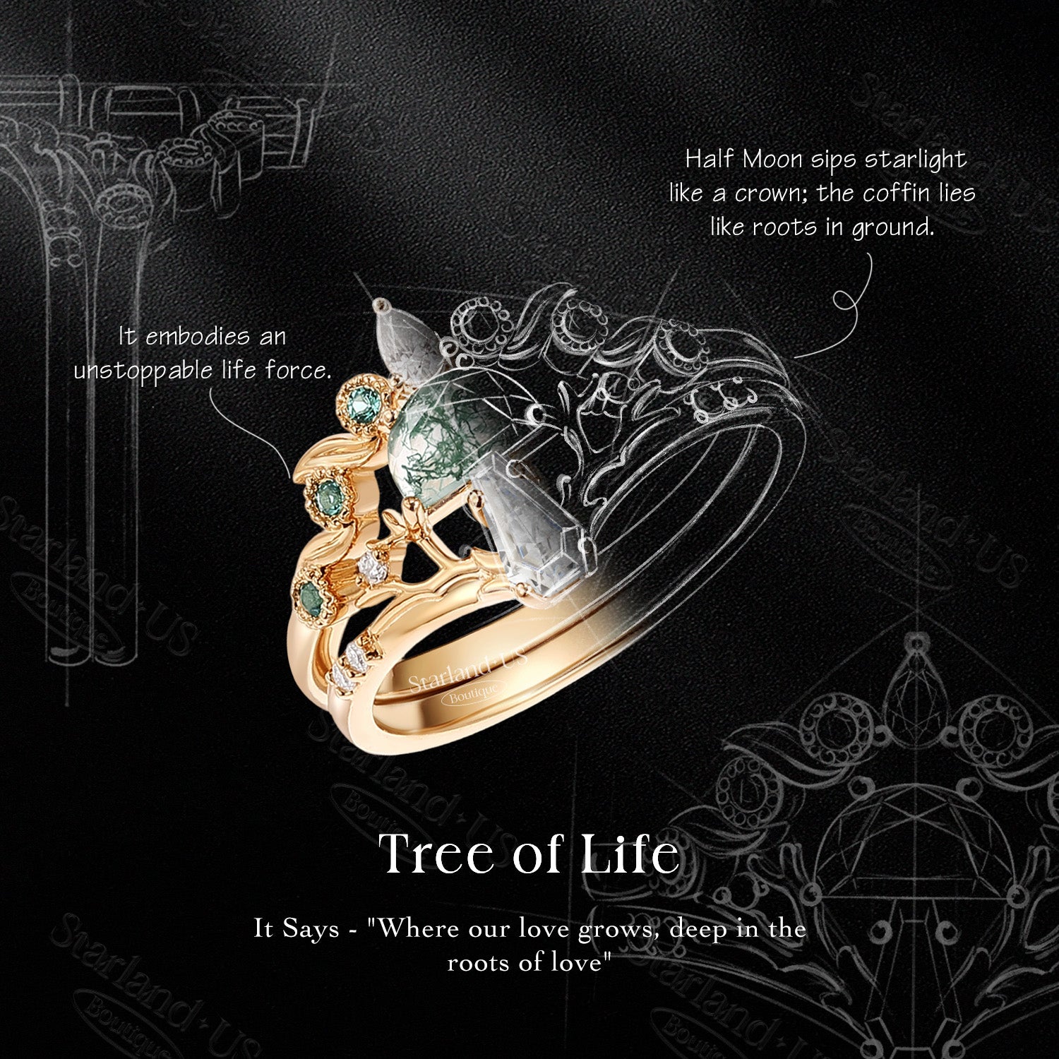Half Moon Moss Agate + Coffin Cut Moissanite 'Tree of Life' Mushroom Engagement Ring Set 2pcs