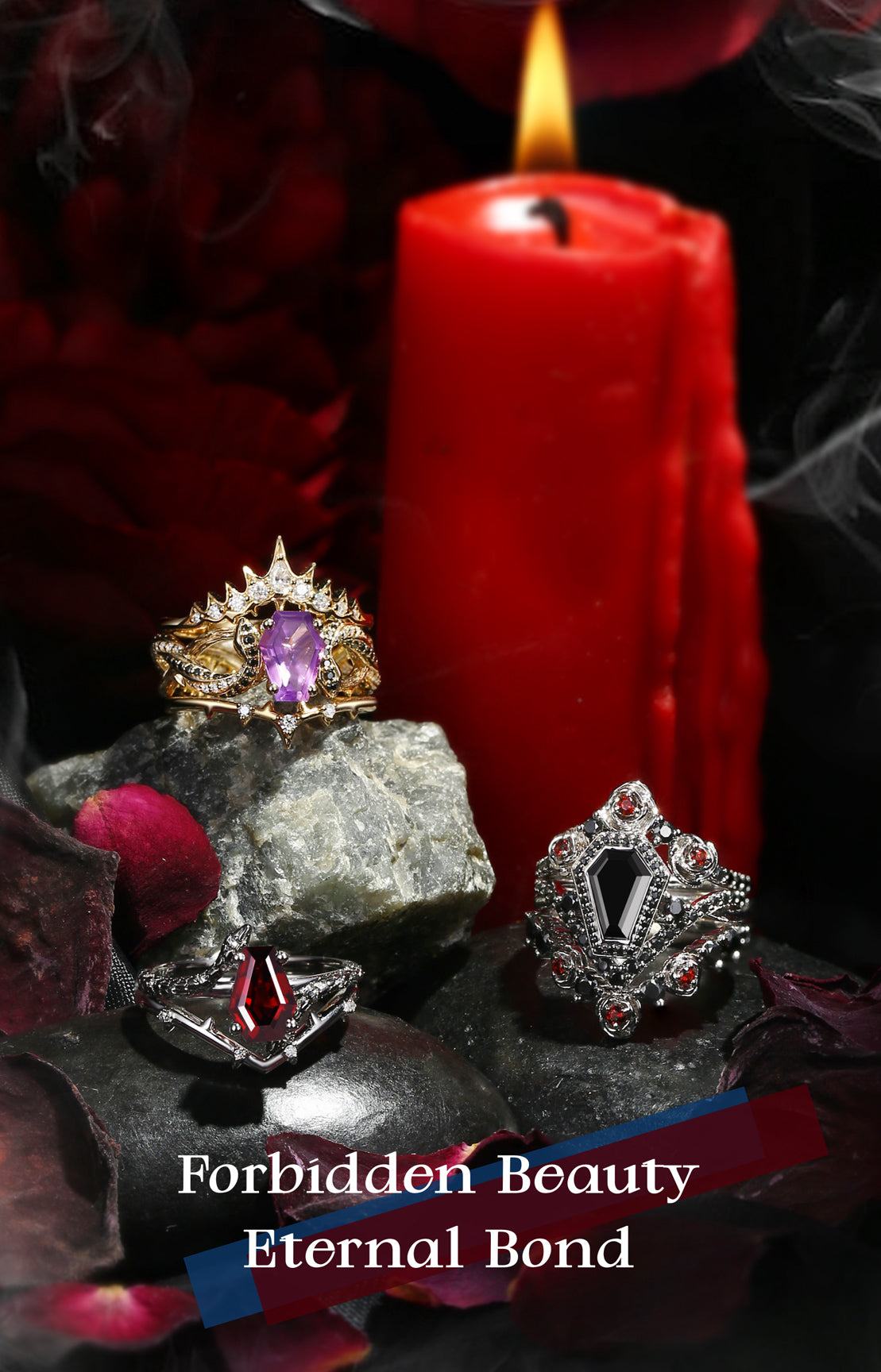 Crescent Moon | Coffin Cut Lab Purple Ruby 'Black Statement' Ring Set 2pcs
