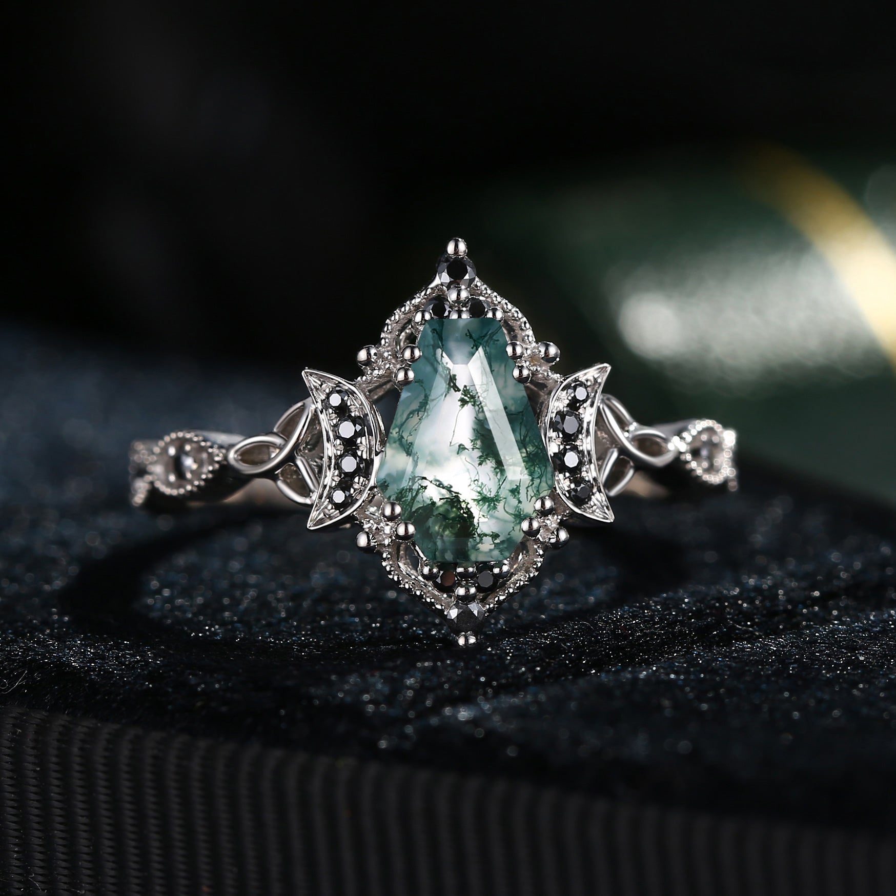 Crescent Moon | Unique Pear Shape Moss Agate Engagement Ring Set 2pcs - Luna