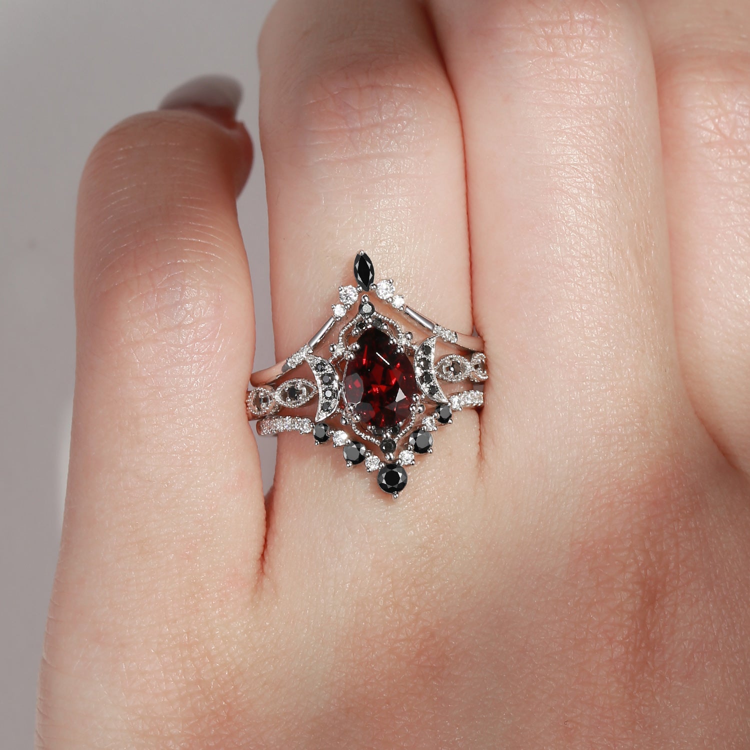 Crescent Moon | 18K Vintage Inspired Pear Shaped Garnet Ring Set 3pcs - Eclipse