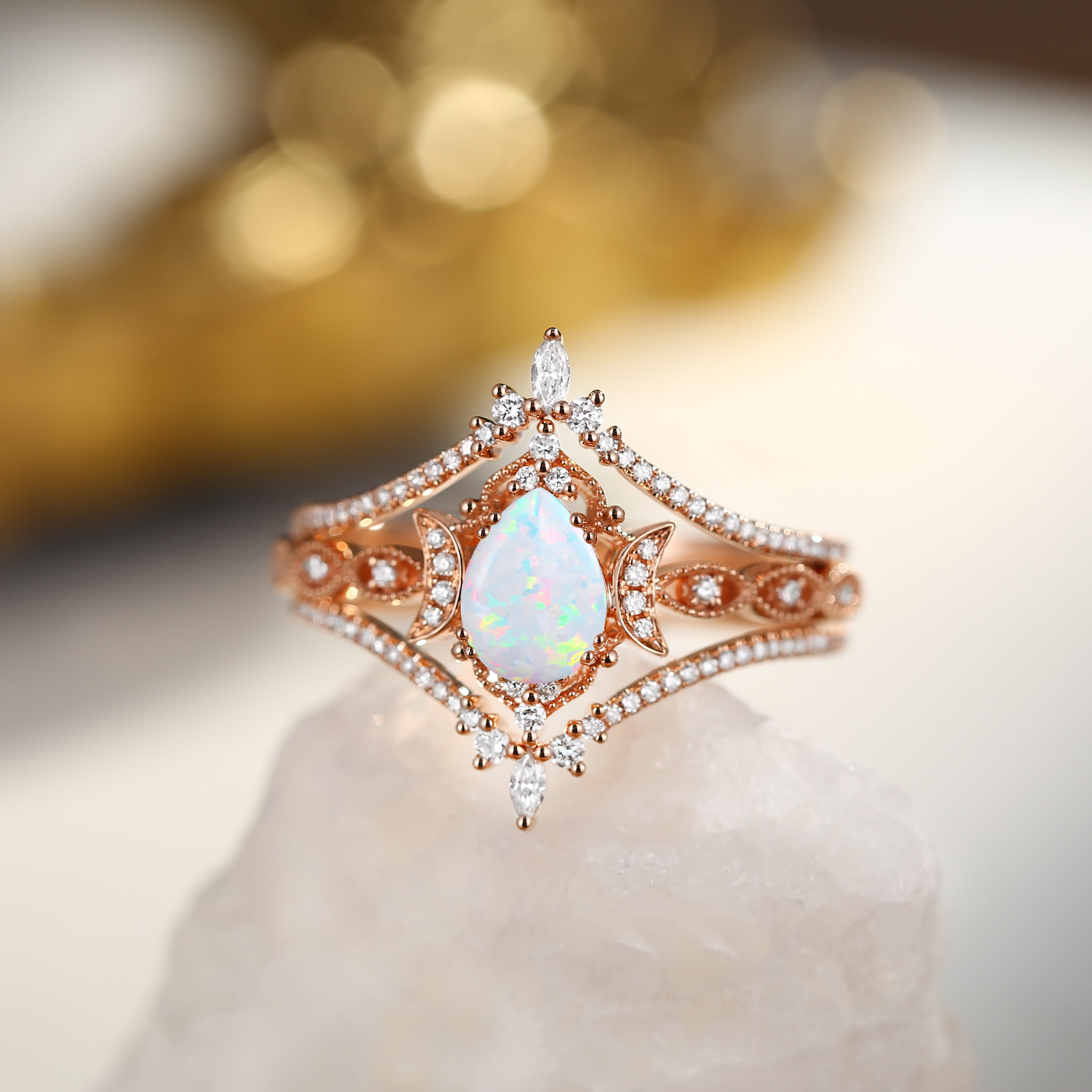 Crescent Moon | Pear Shaped Natural Opal Engagement Ring Sets 3pcs - Olivia