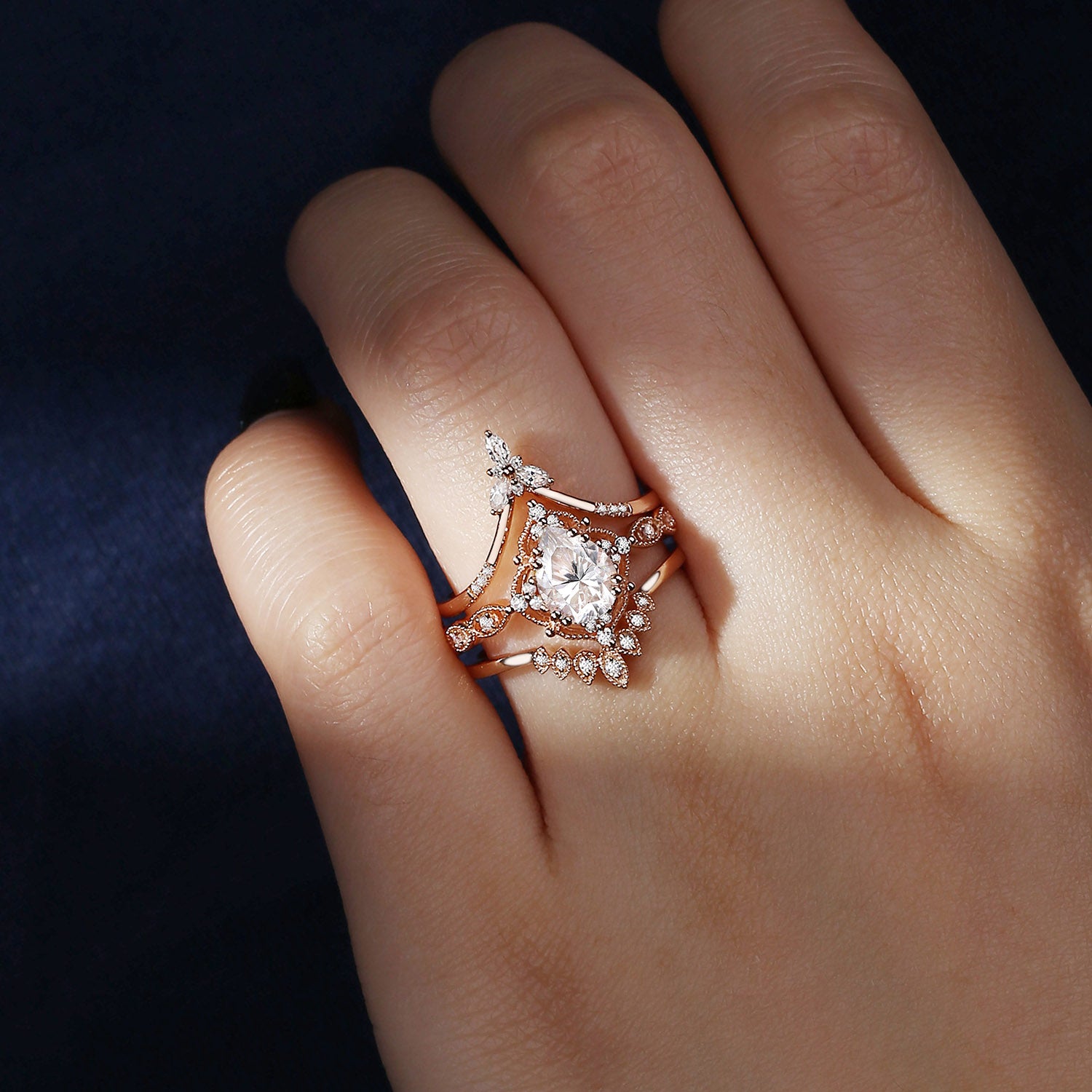 Crescent Moon | Coffin Cut Moonstone Sunburst Design Engagement Ring Set 3pcs