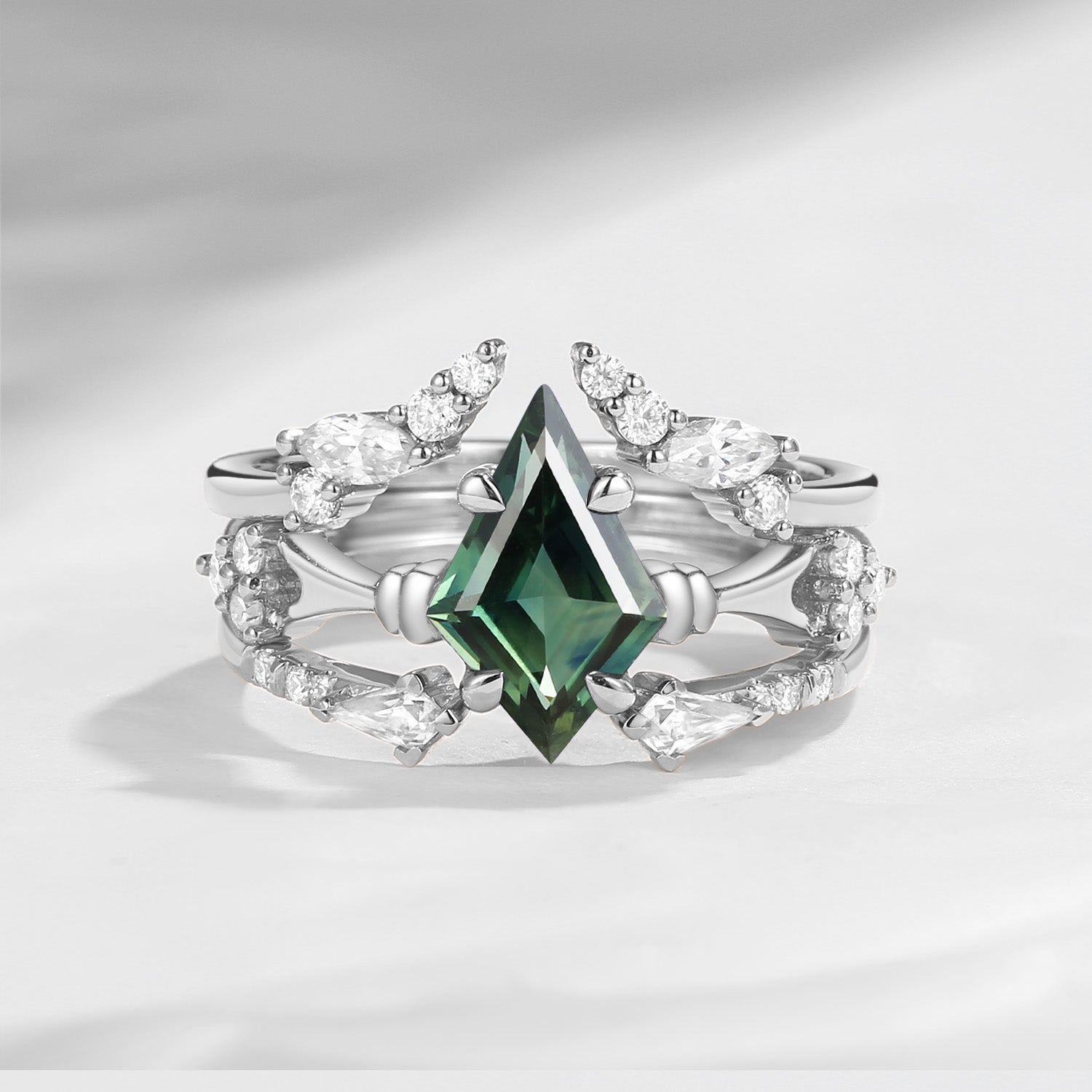 Crescent Moon | Coffin Cut Teal Moissanite 'Black Statement' Ring Set 3pcs