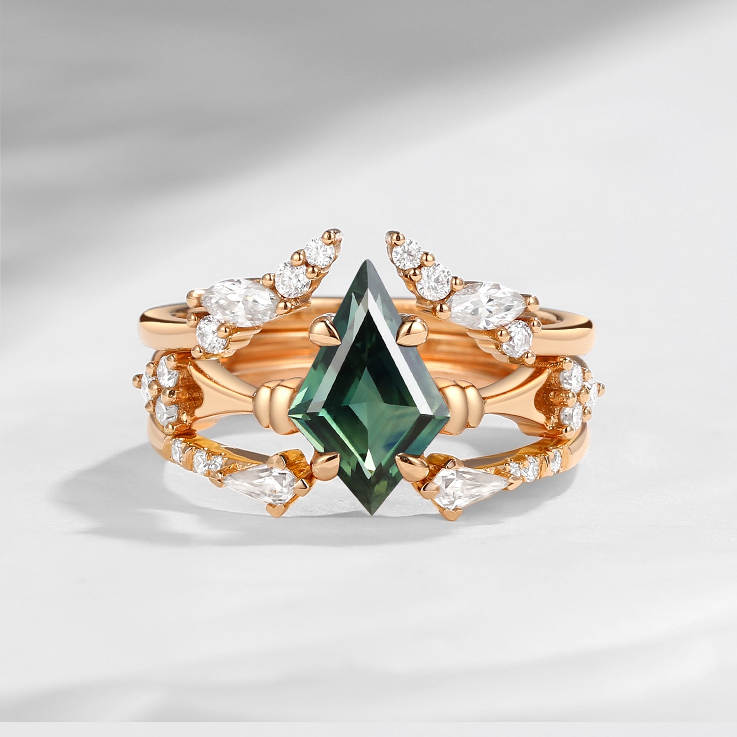 Vintage Inspired Kite Cut Natural Teal Sapphire Bridal Set 3pcs