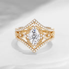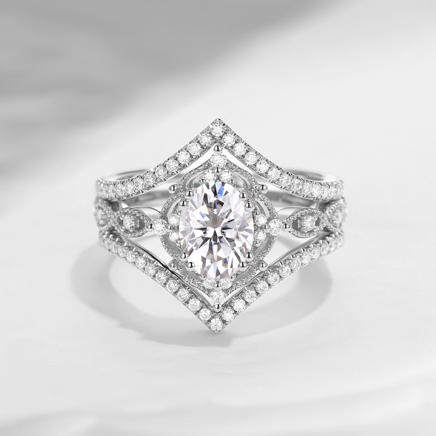 Vintage Rose Gold 1.5ct Oval Moissanite Ring Bridal Set 3pcs Art Deco Engagement Ring Flower Ring Chevron Band Stacking Ring Cluster Halo