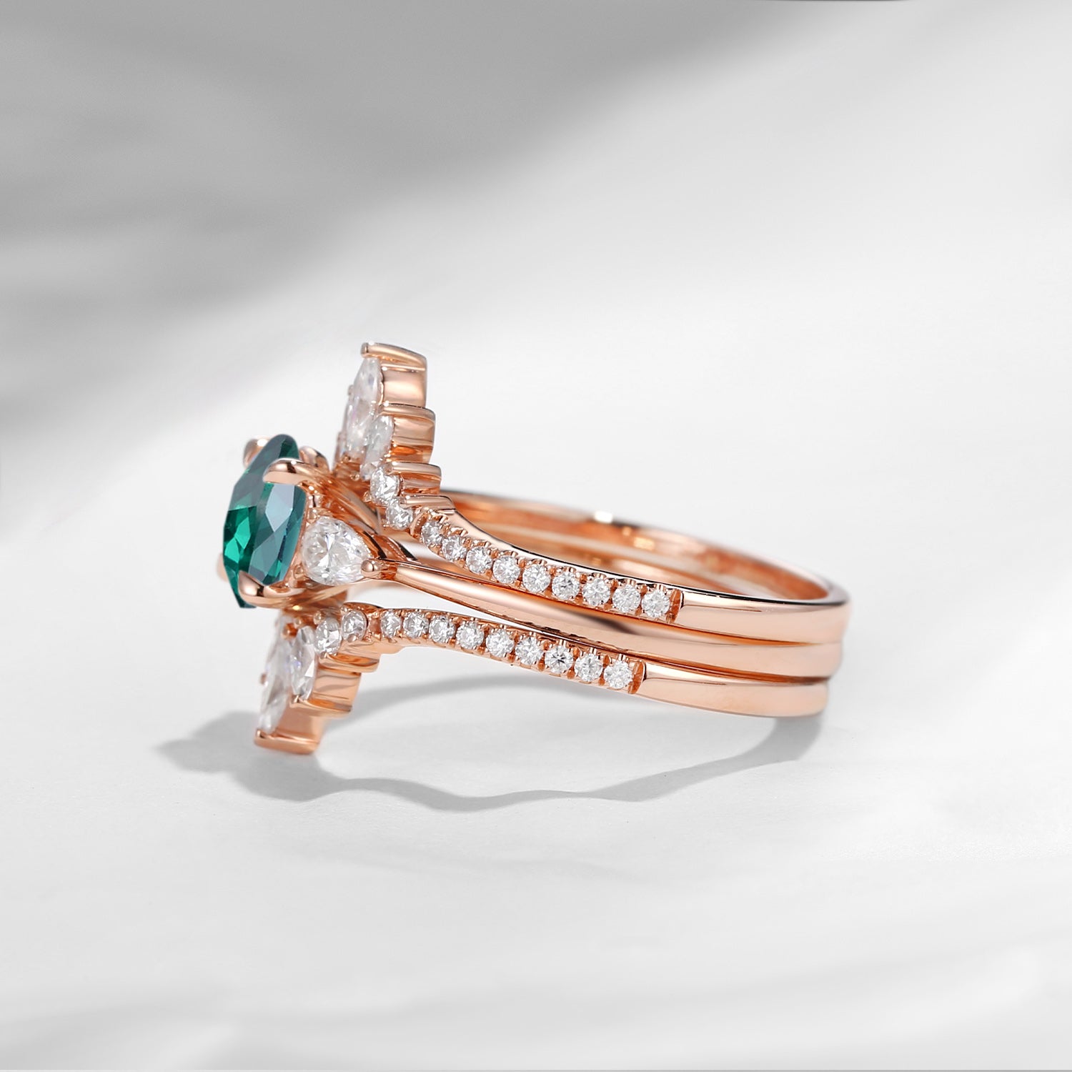 Lab Emerald Bridal Ring Set 3pcs Cluster Engagement Ring Set Marquise Wing Enhancer Antique Chevron Three Stones Pear Tear