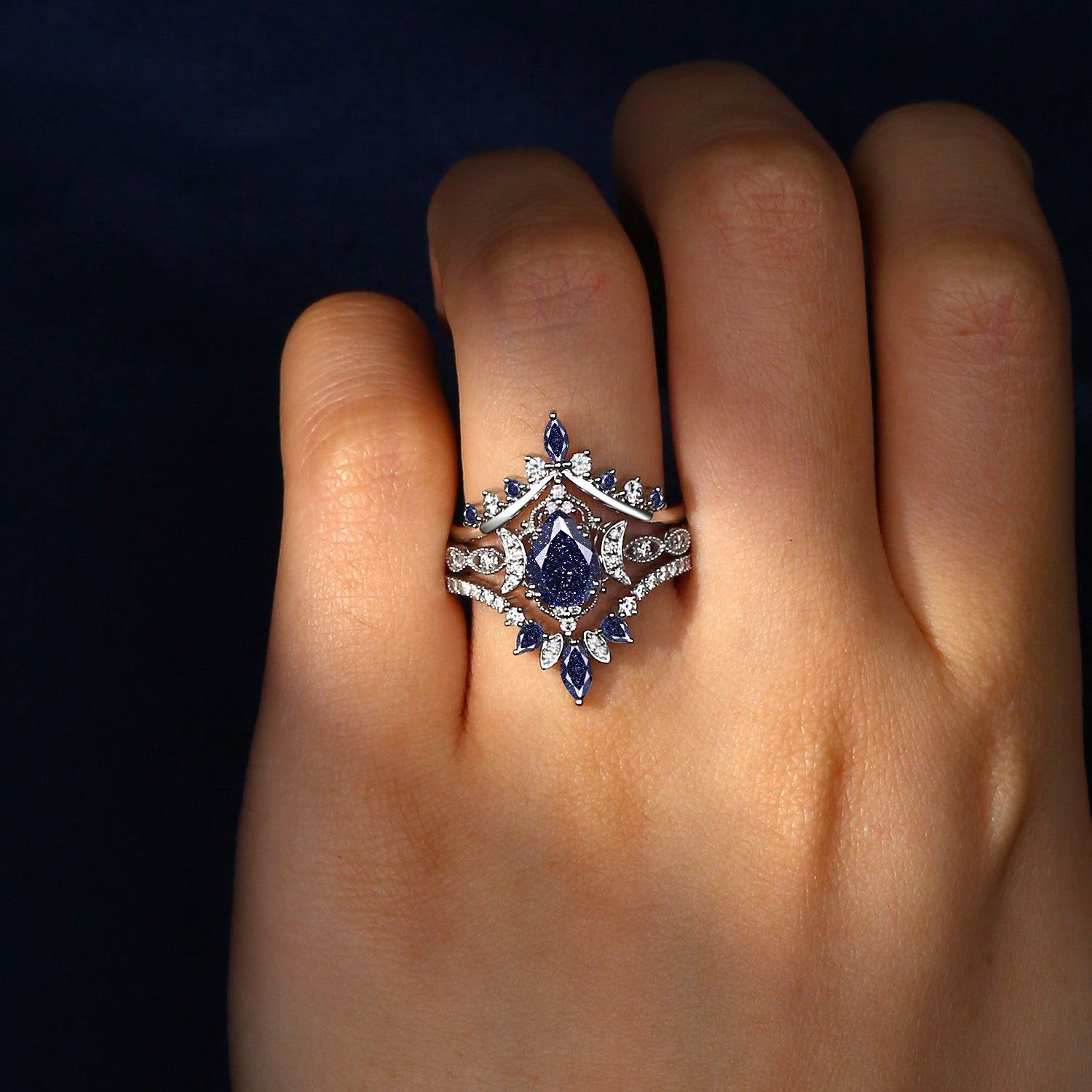 Crescent moon | Antique Pear Cut Blue Sandstone Engagement Ring Set 3pcs