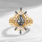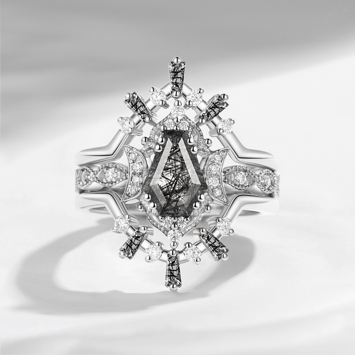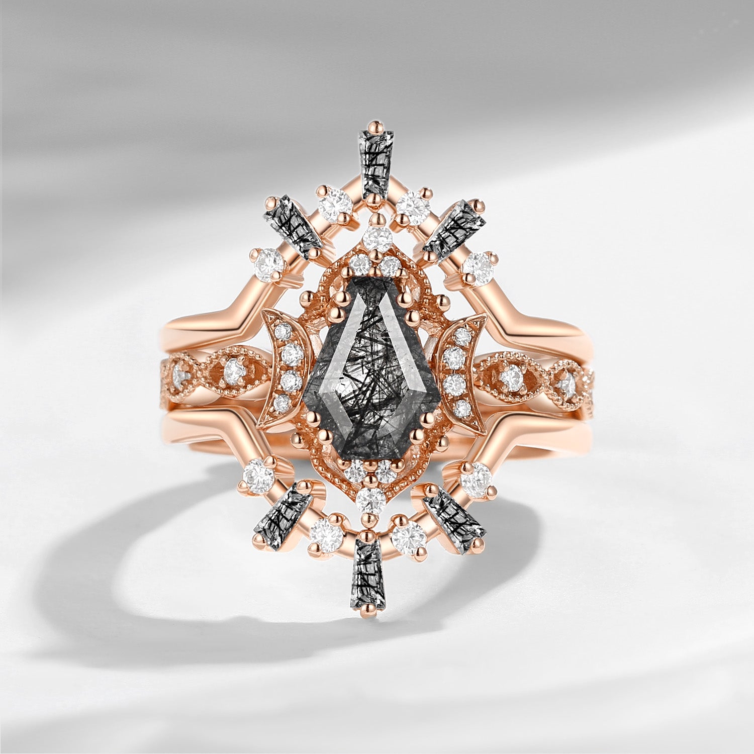 Crescent Moon | Coffin Black Rutilated Quartz Deco Baguette Sunburst Design Engagement Ring Set 3pcs
