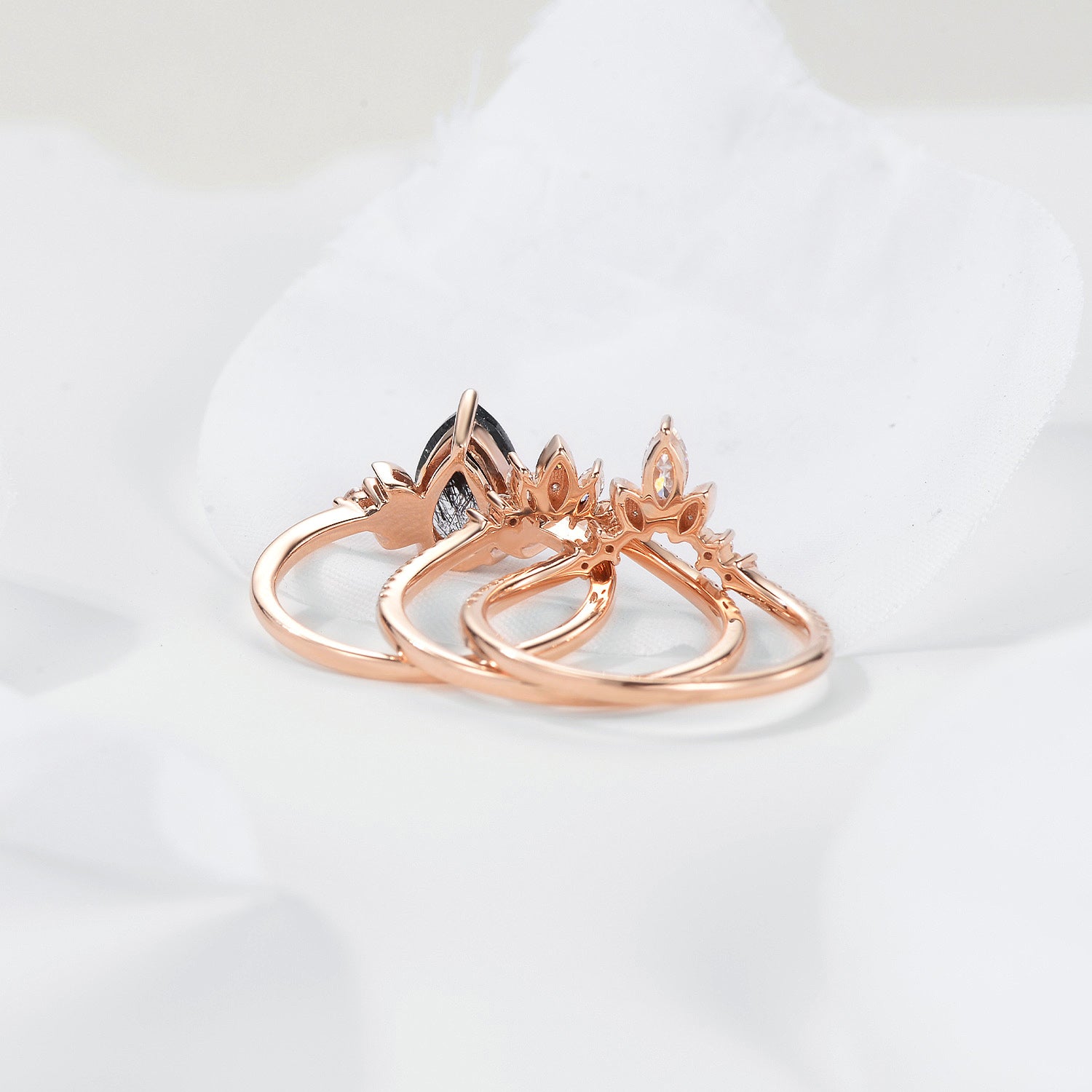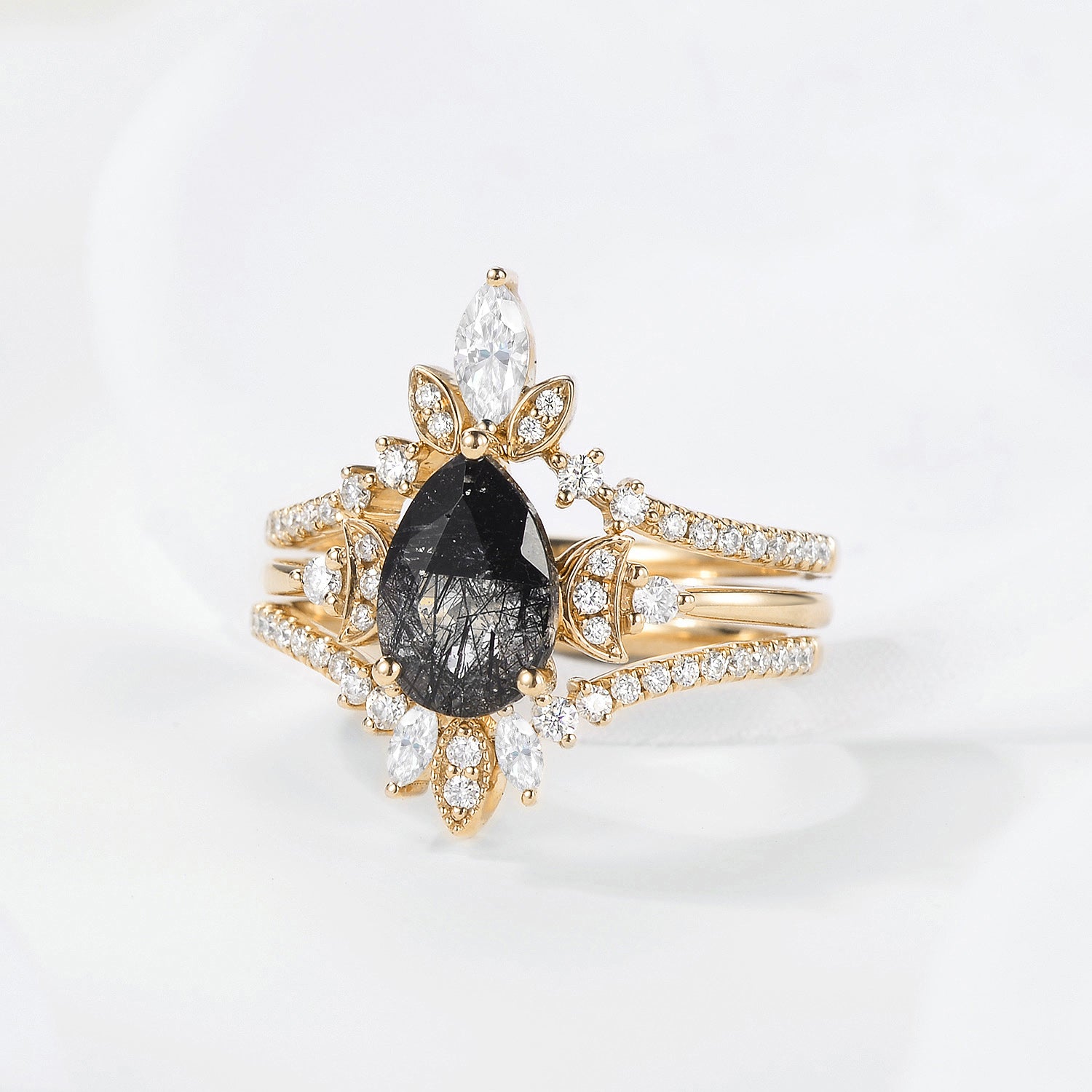 Crescent moon | Vintage Inspired Pear Cut Black Rutilated Quartz Engagement Ring Set 3pcs