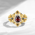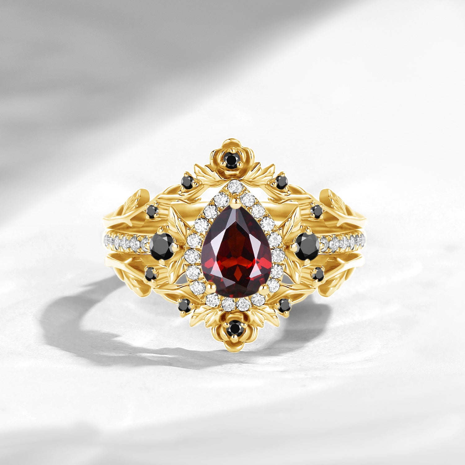 Nature Inspired Pear Cut Garnet Halo Engagement Ring Set 3pcs