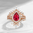 Pear Shaped Lab Ruby Engagement Ring Set Rose Gold Milgrain Cluster Ring Vintage Style Unique Bridal Anniversary
