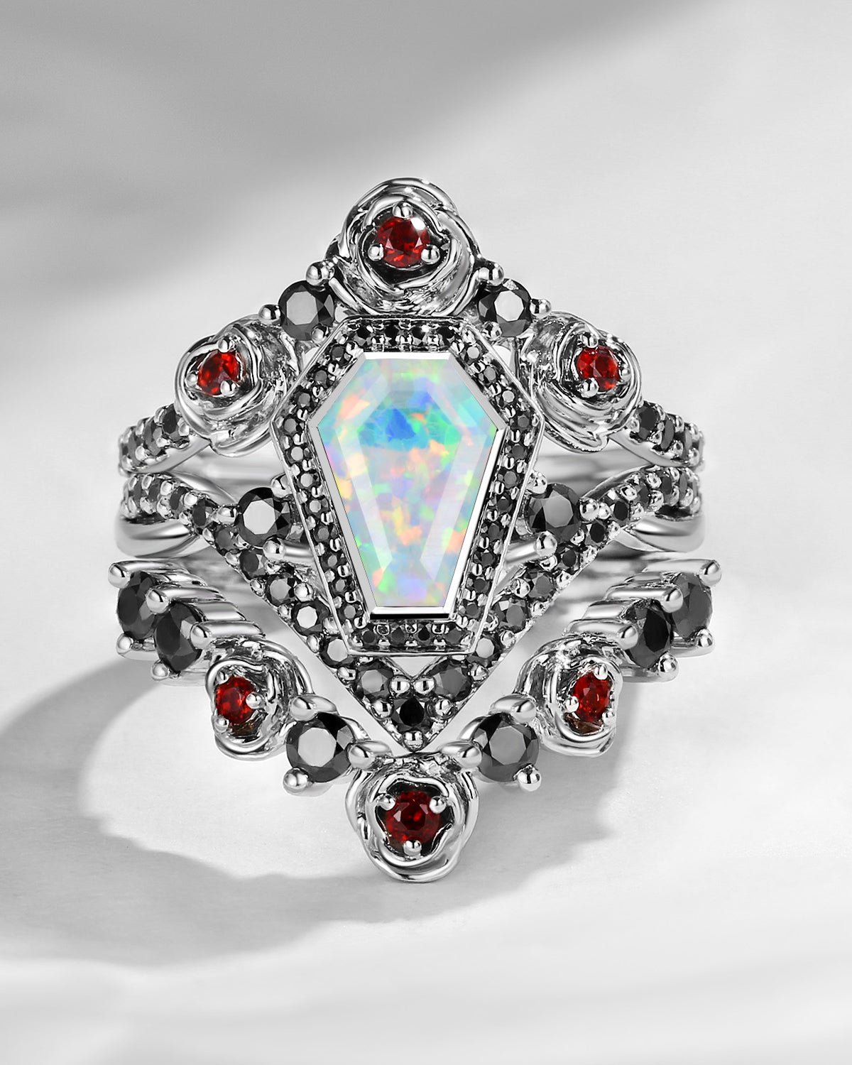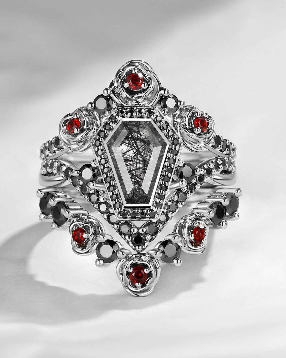 Unique Coffin Black Rutilated Quartz Gothic Rose Flower Engagement Ring Set 3pcs