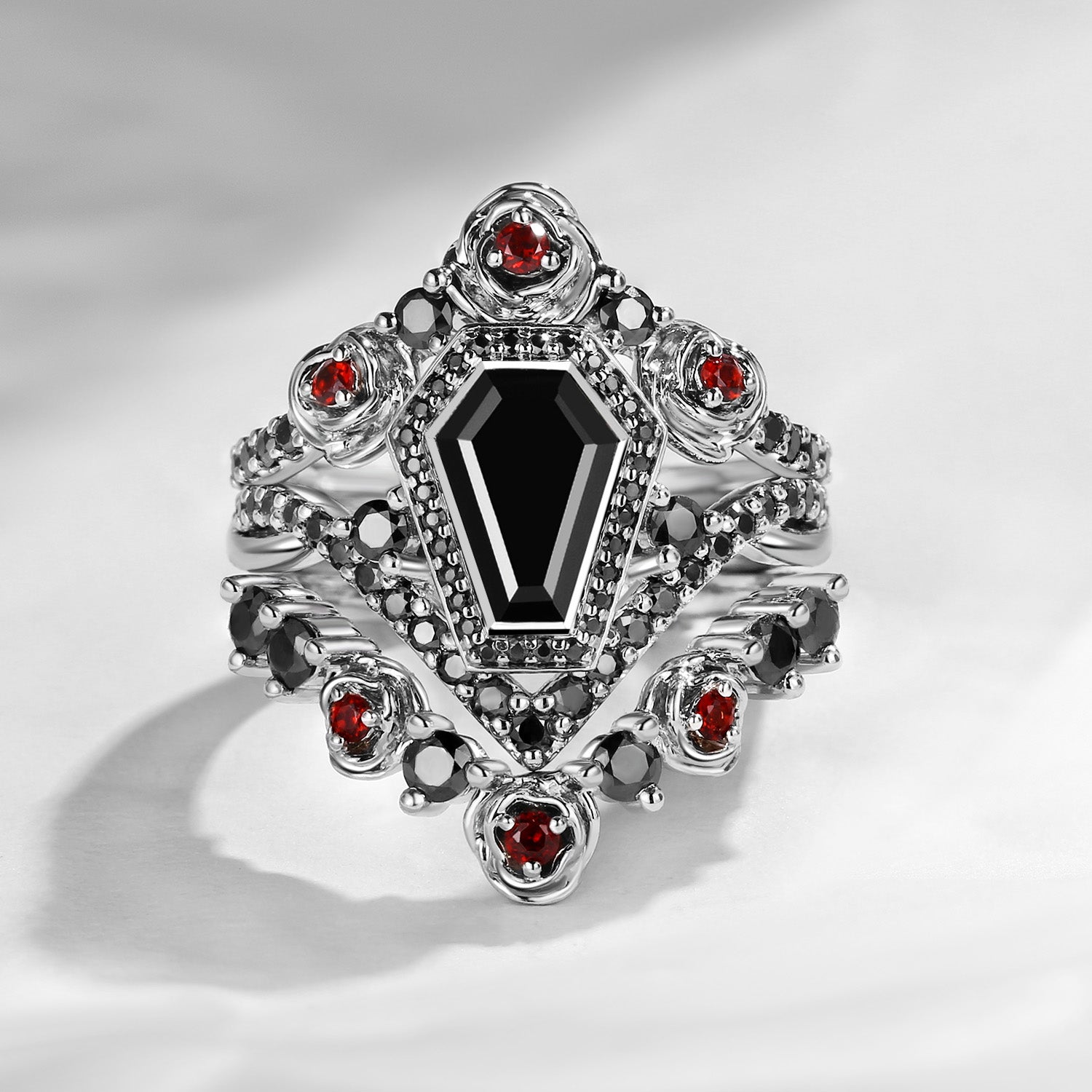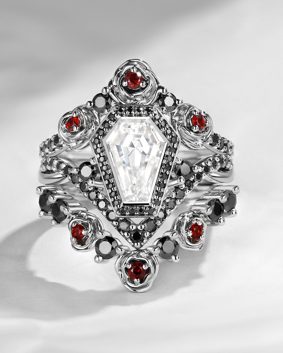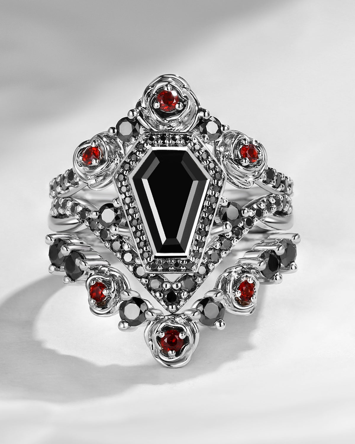 Unique Coffin Salt & Pepper Diamond Gothic Rose Flower Engagement Ring Set 3pcs