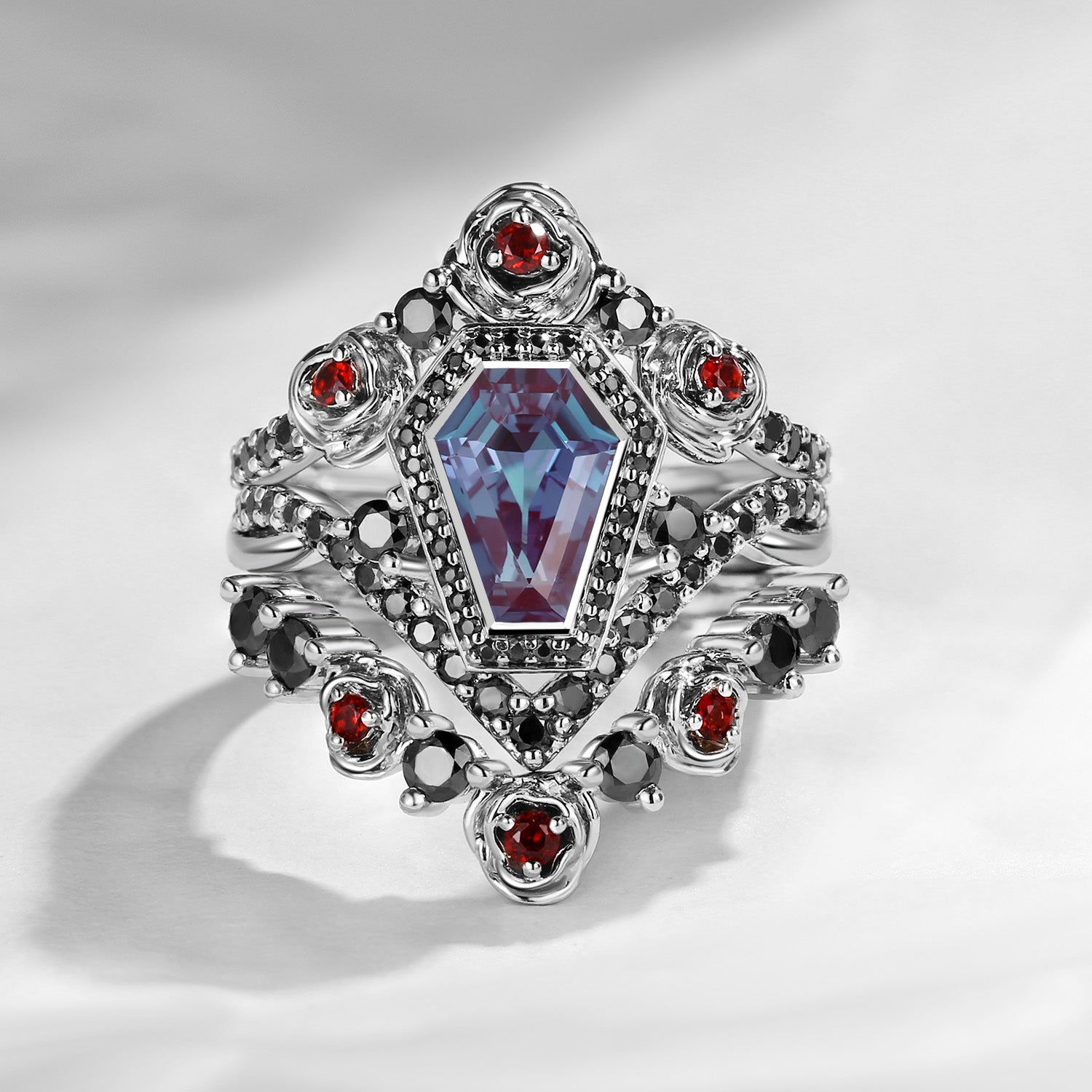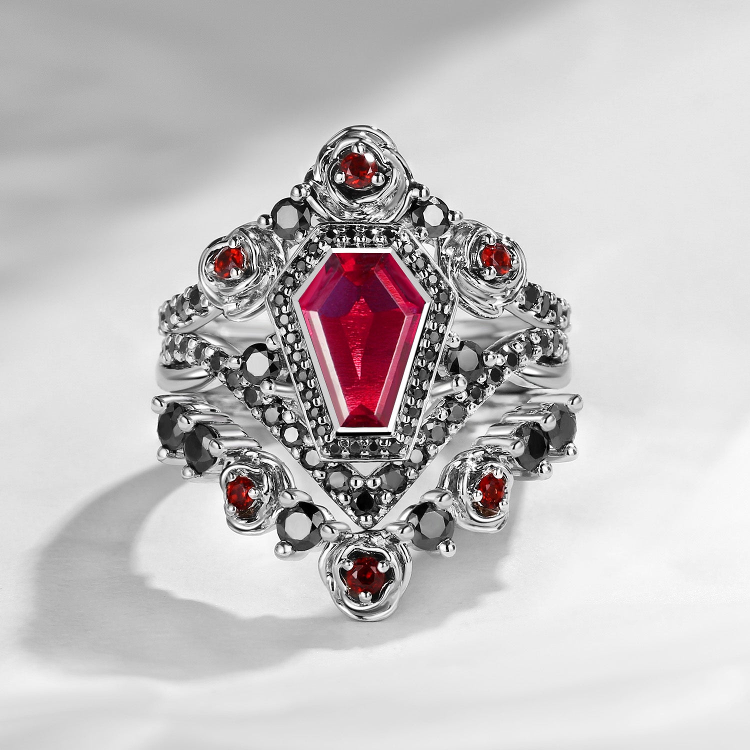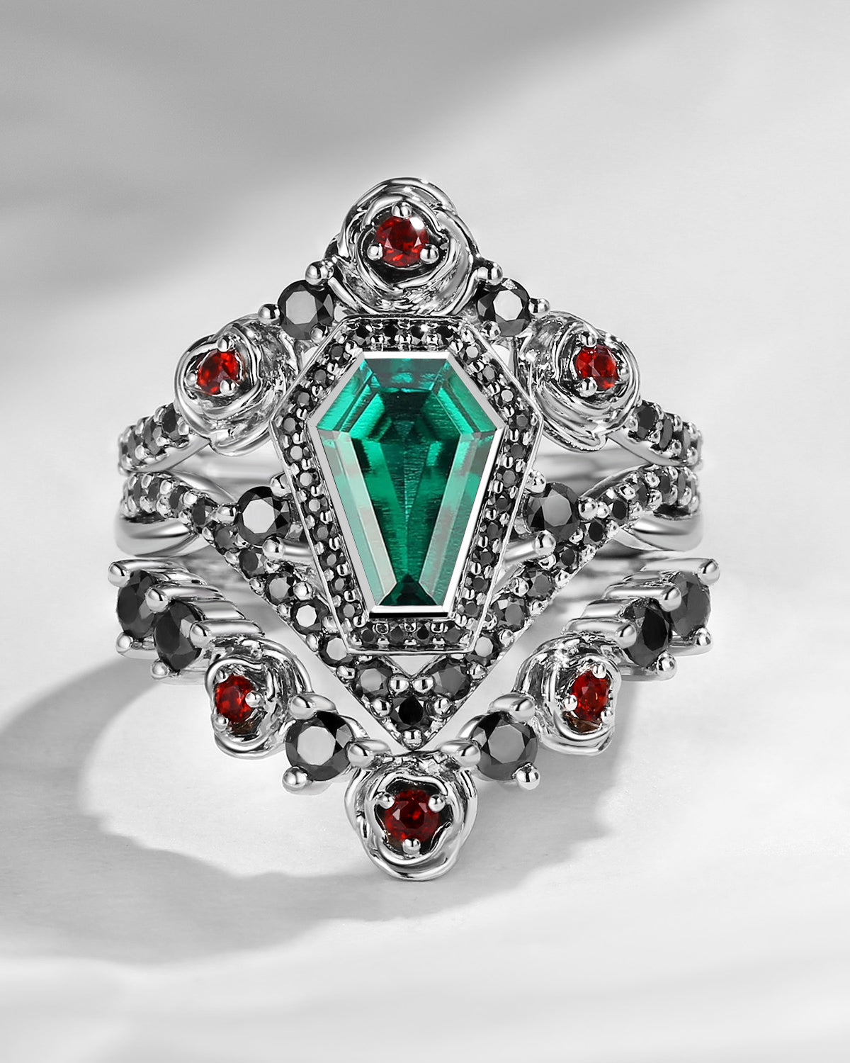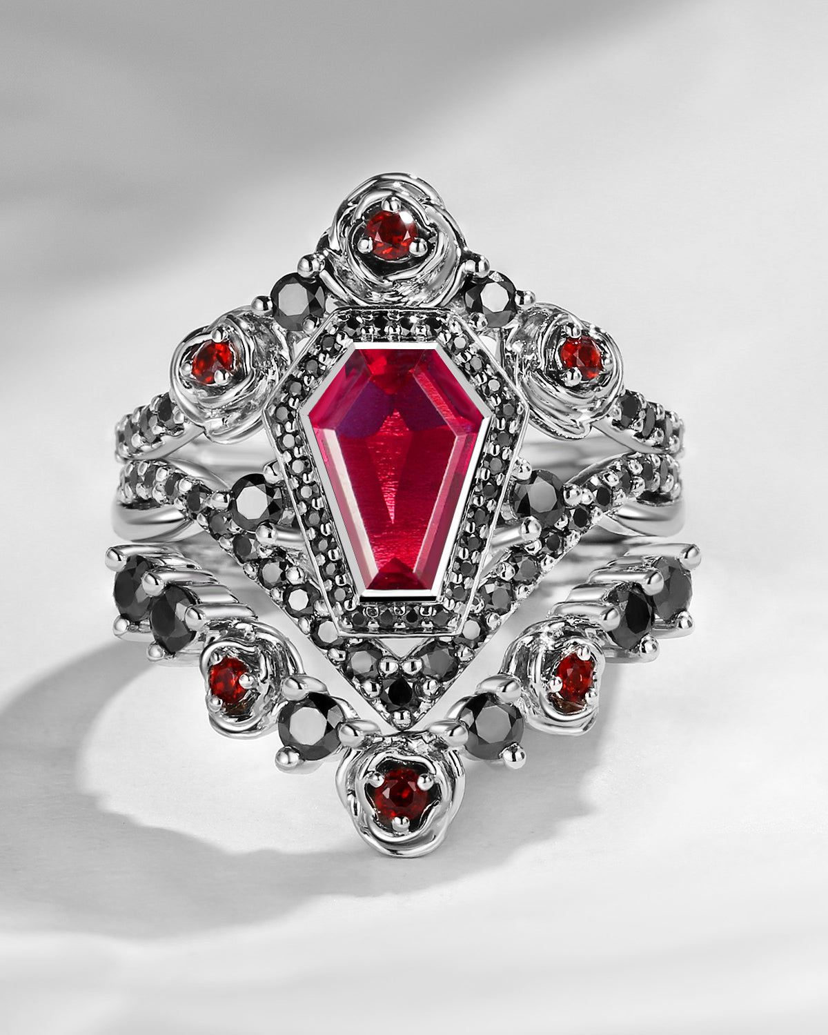Unique Coffin Salt & Pepper Diamond Gothic Rose Flower Engagement Ring Set 3pcs