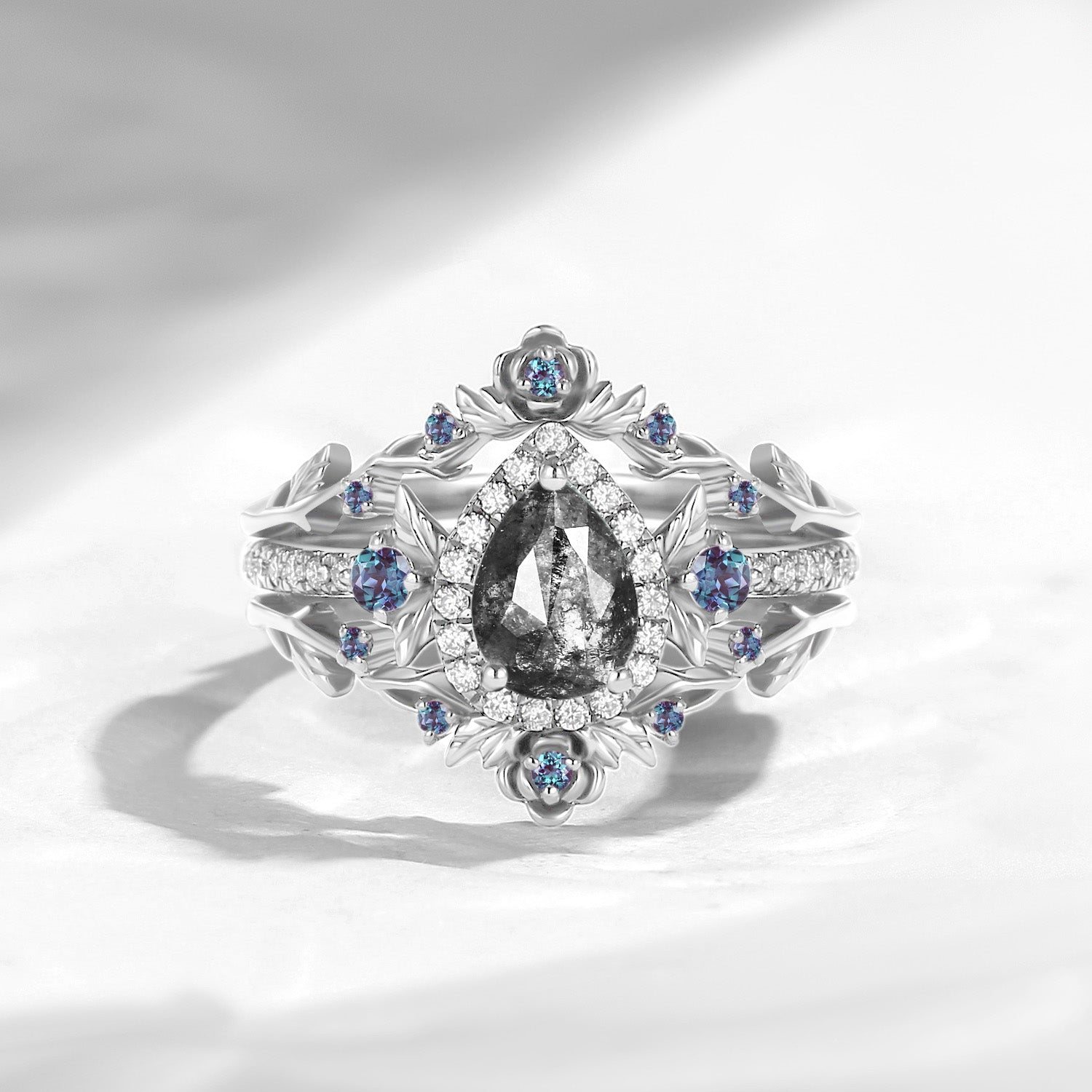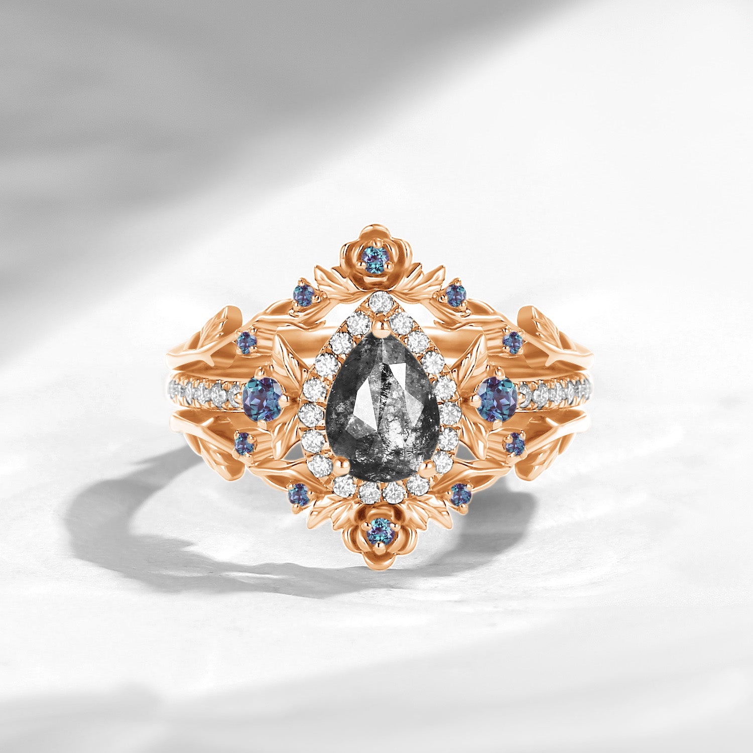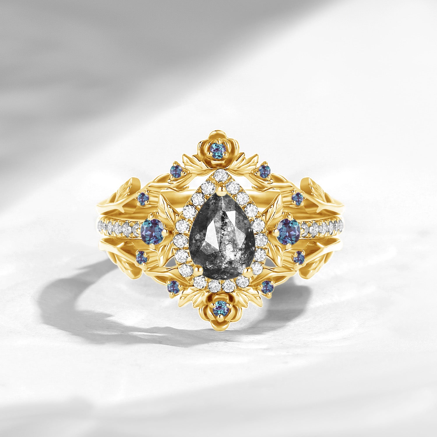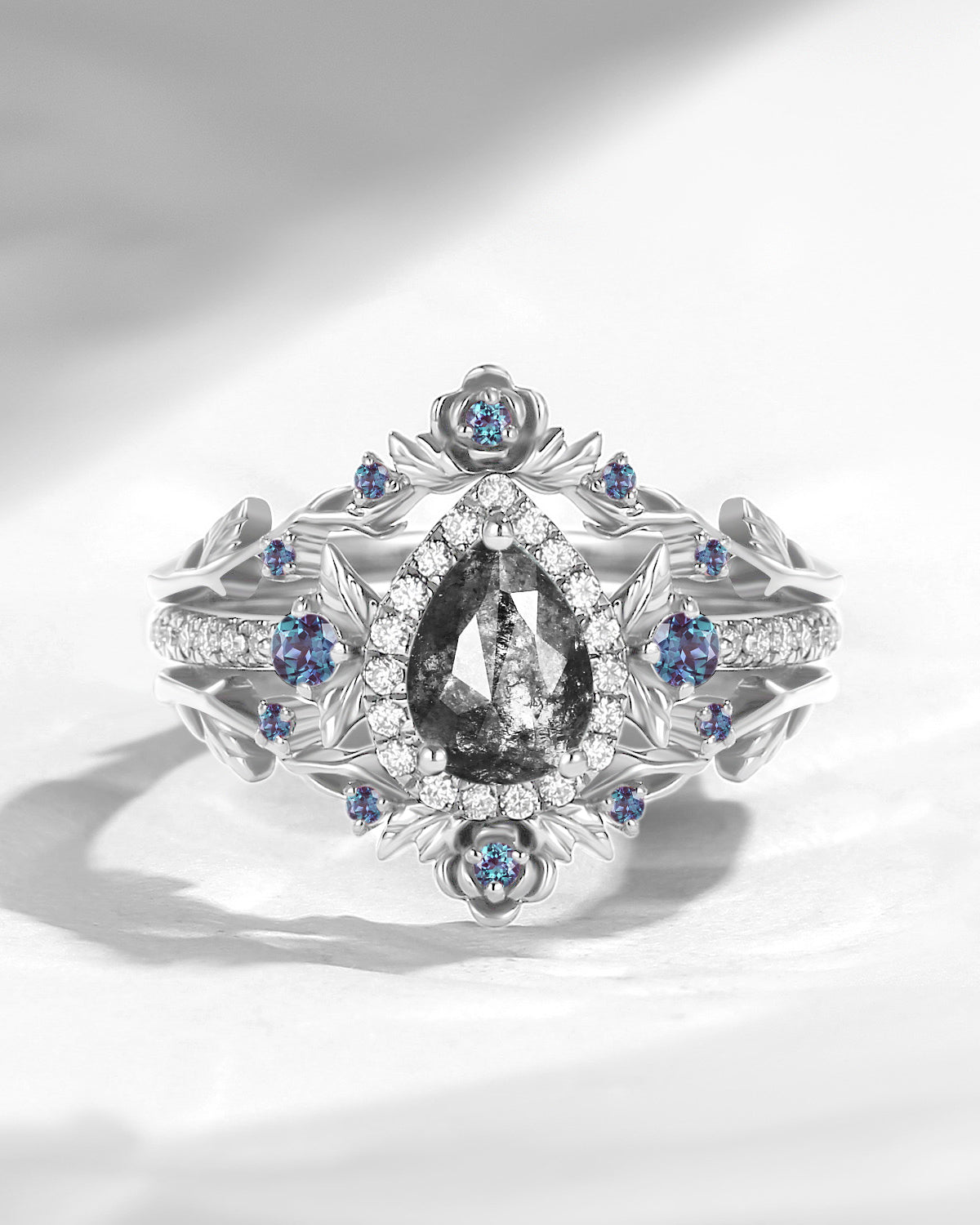 Nature Inspired Pear Cut Salt & Pepper Diamond Halo Engagement Ring Set 3pcs