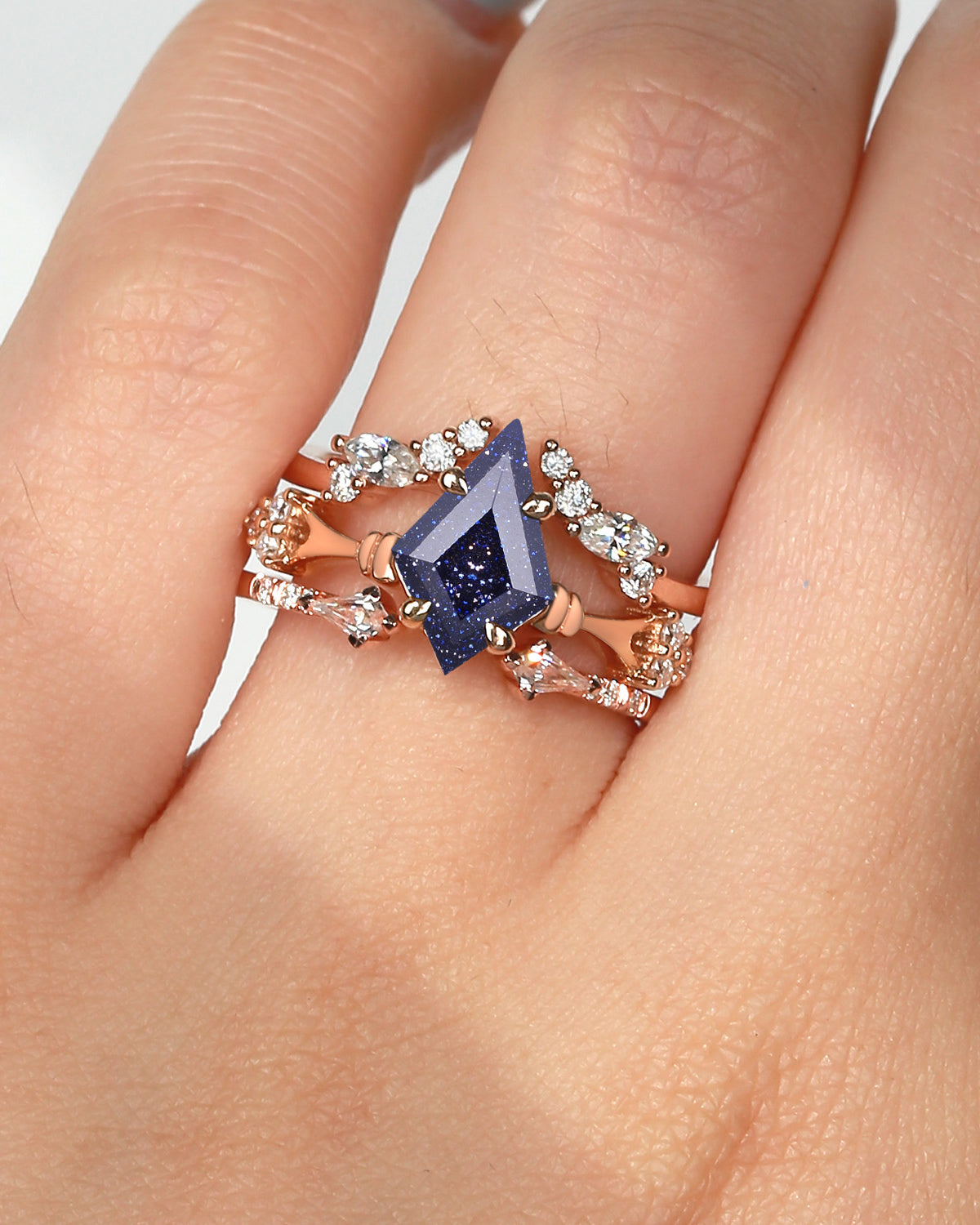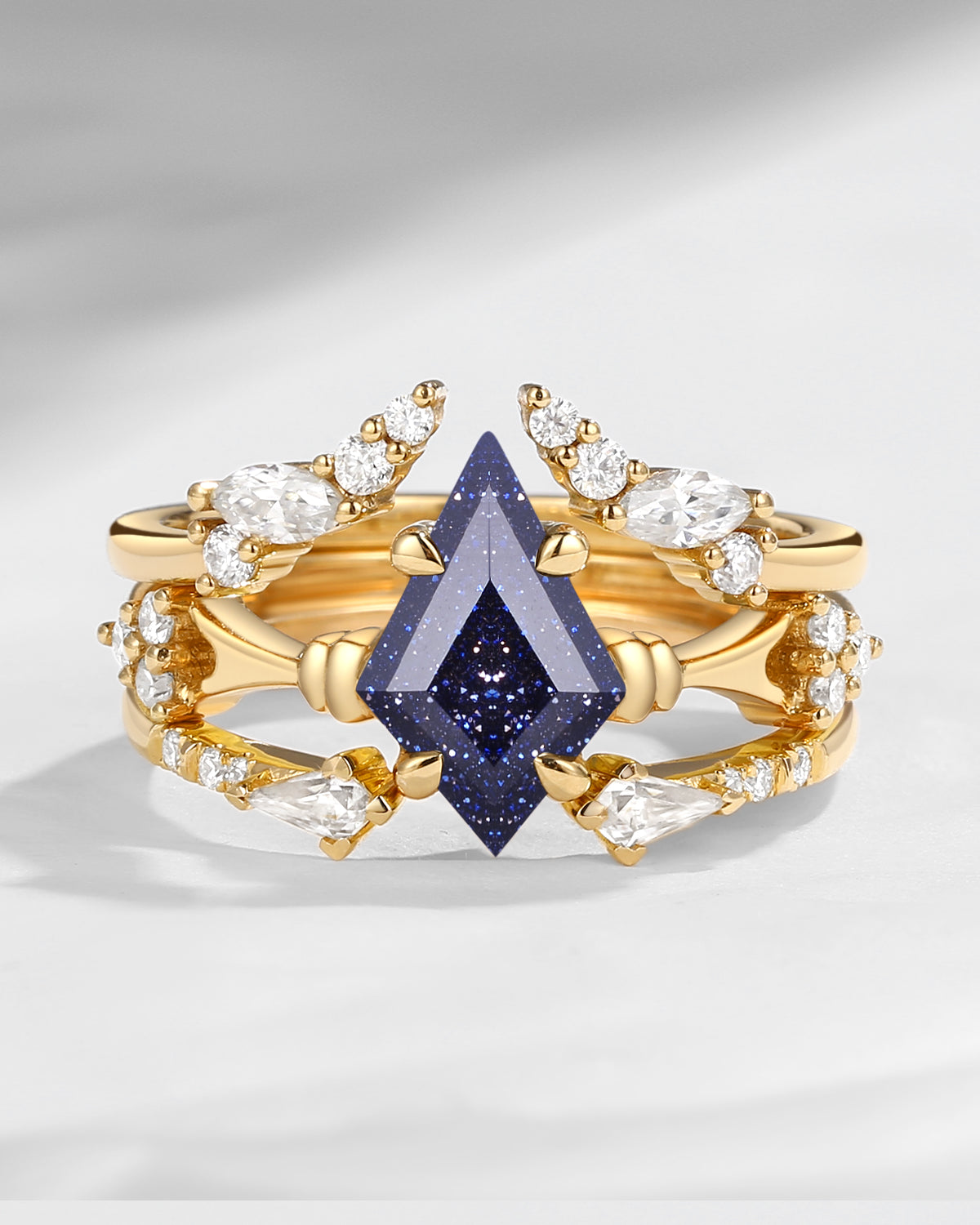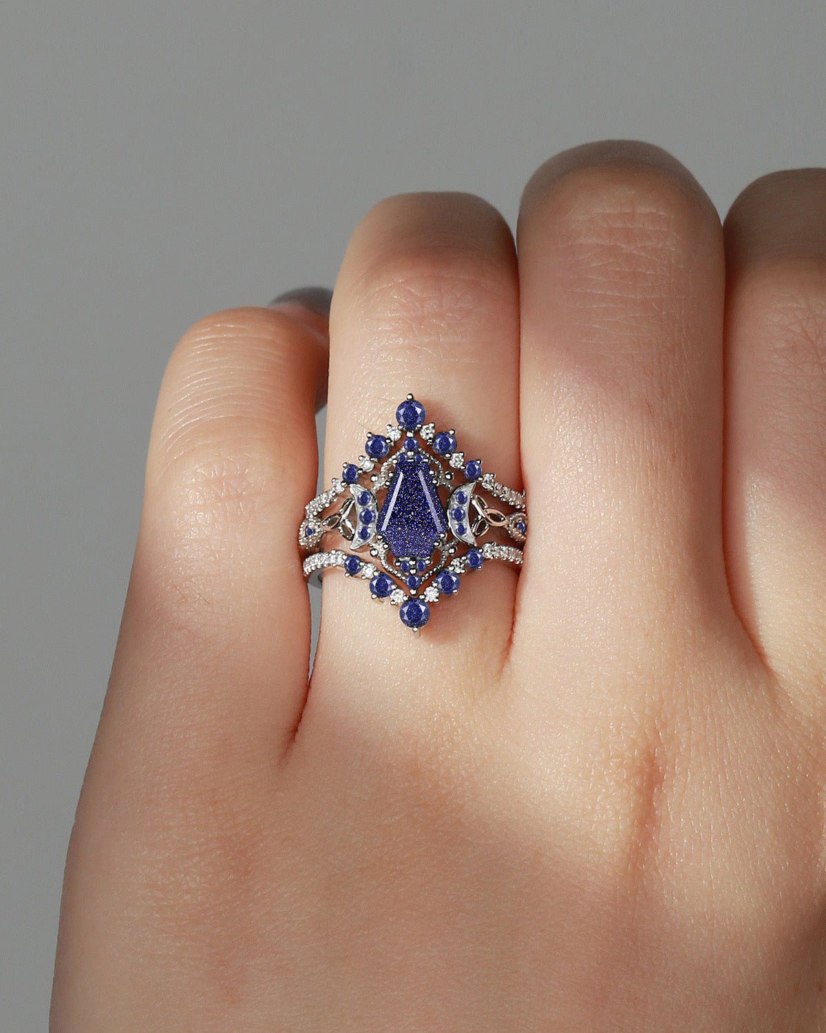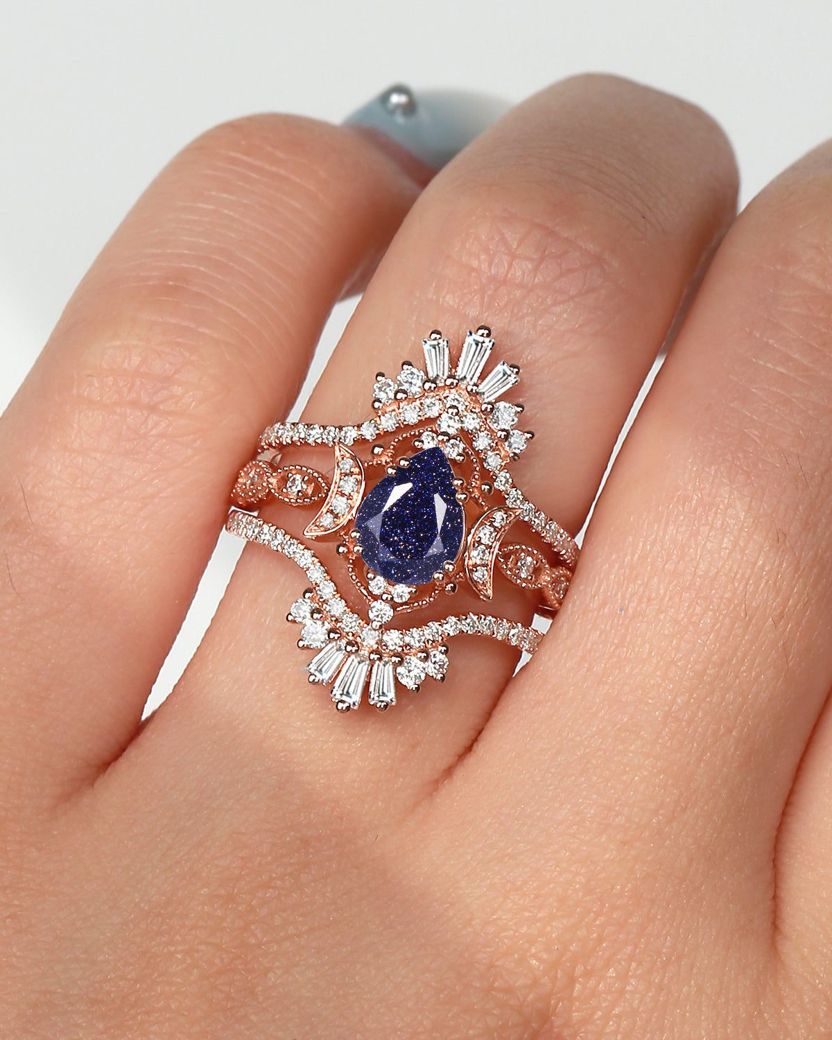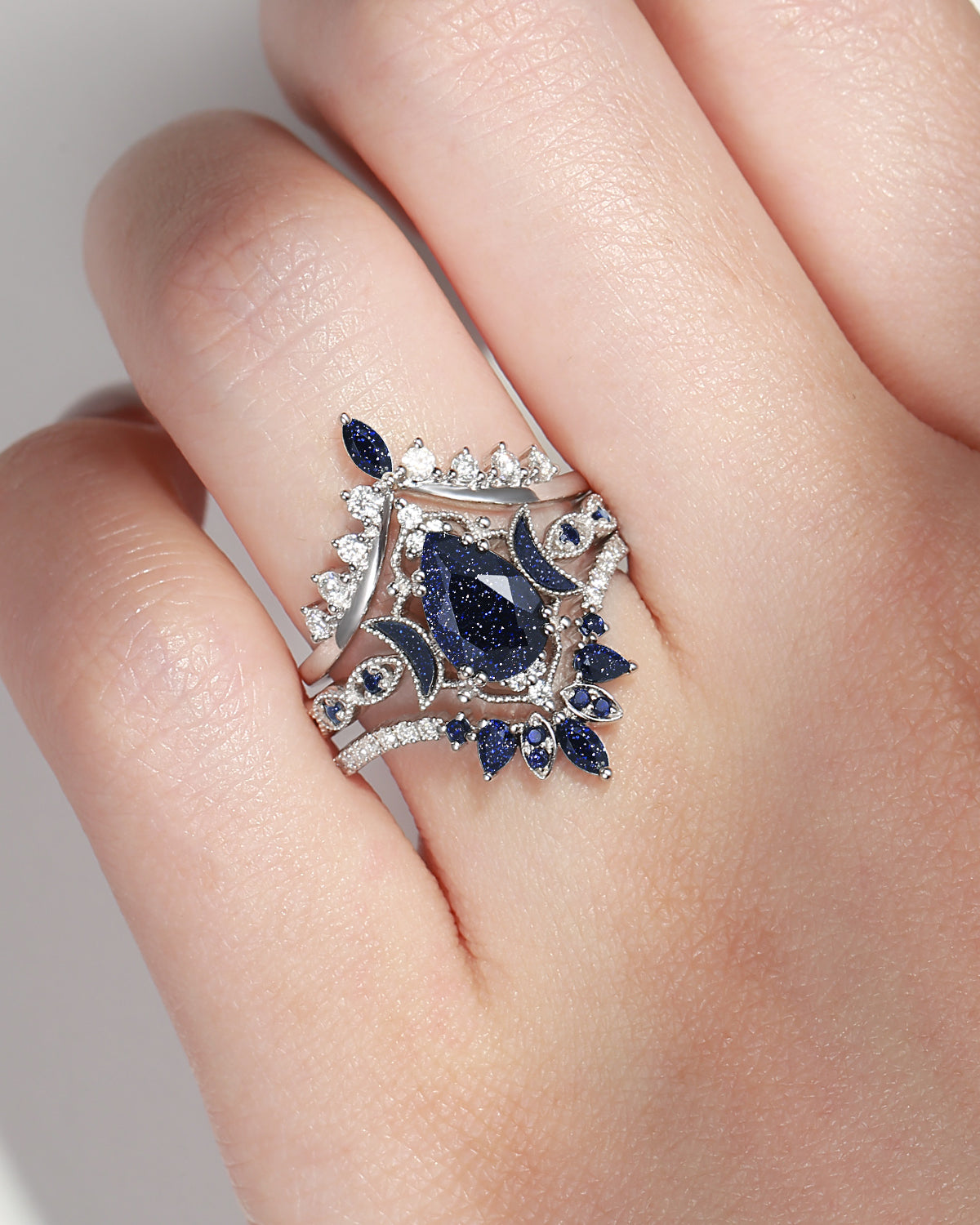 Crescent Moon | Maximalist Style Pear Shaped Blue Sandstone Engagement Ring 3pcs