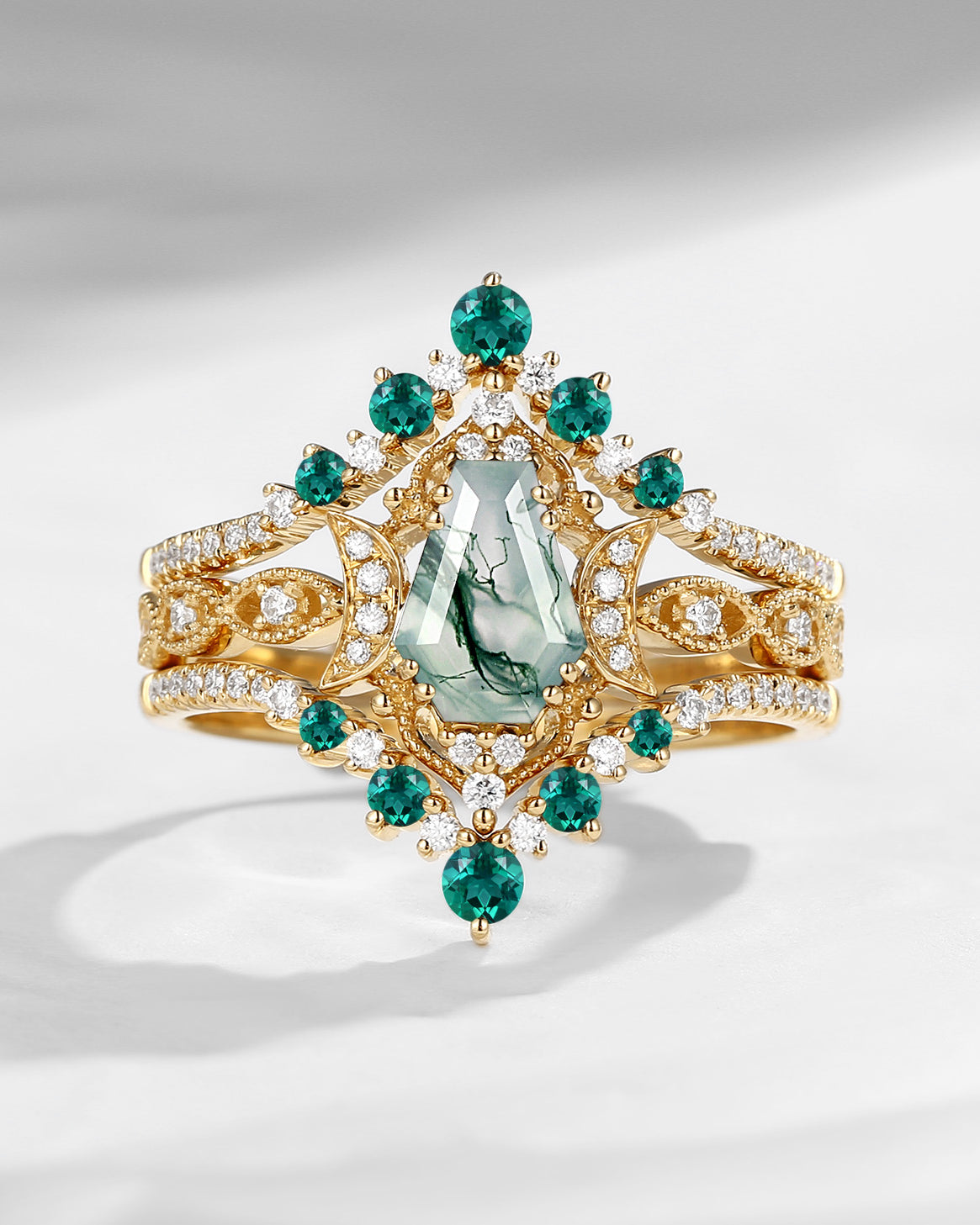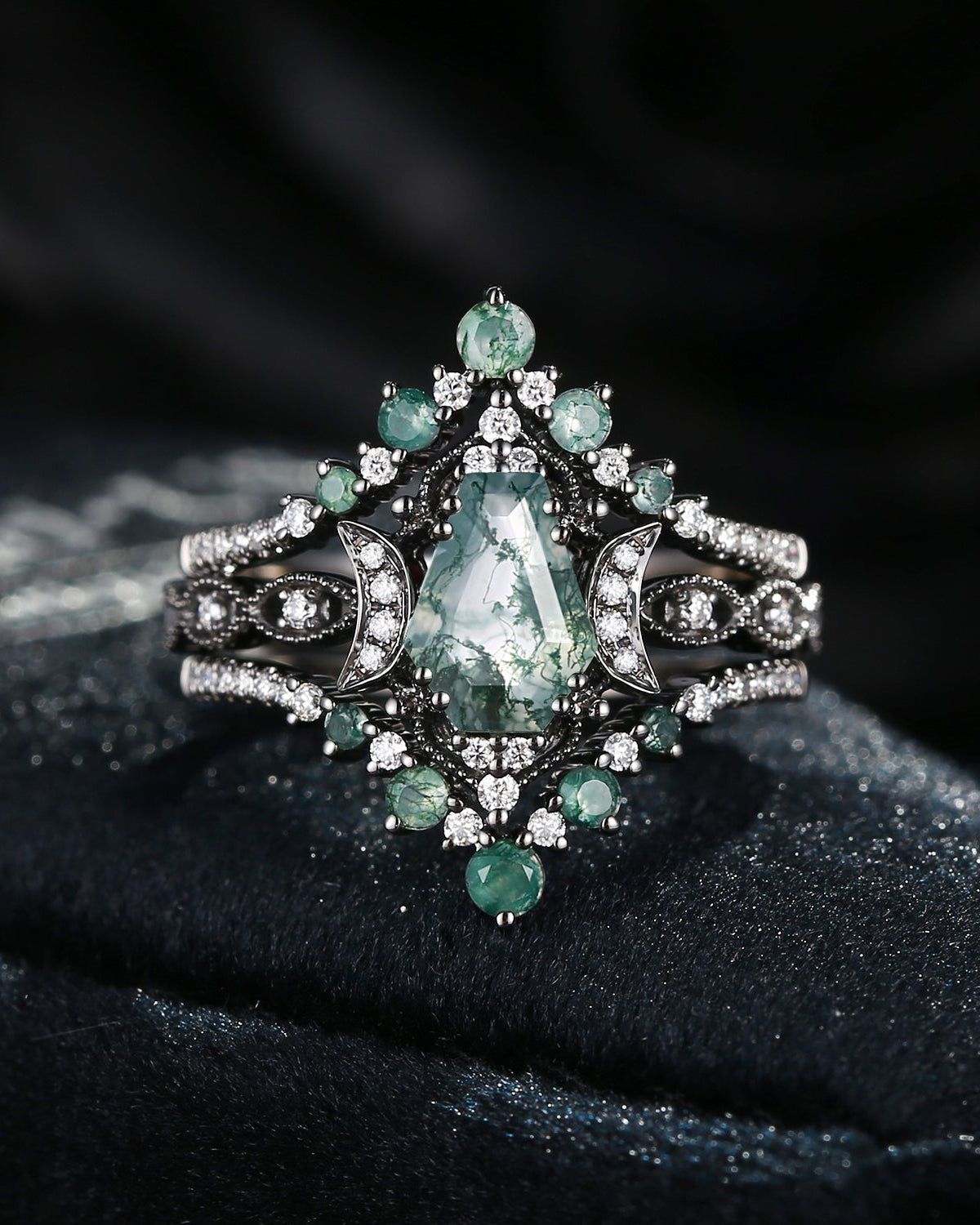 Crescent Moon | Coffin Moss Agate & Lab Emerald Ring 3pcs 18k - Till Death Do Us Apart