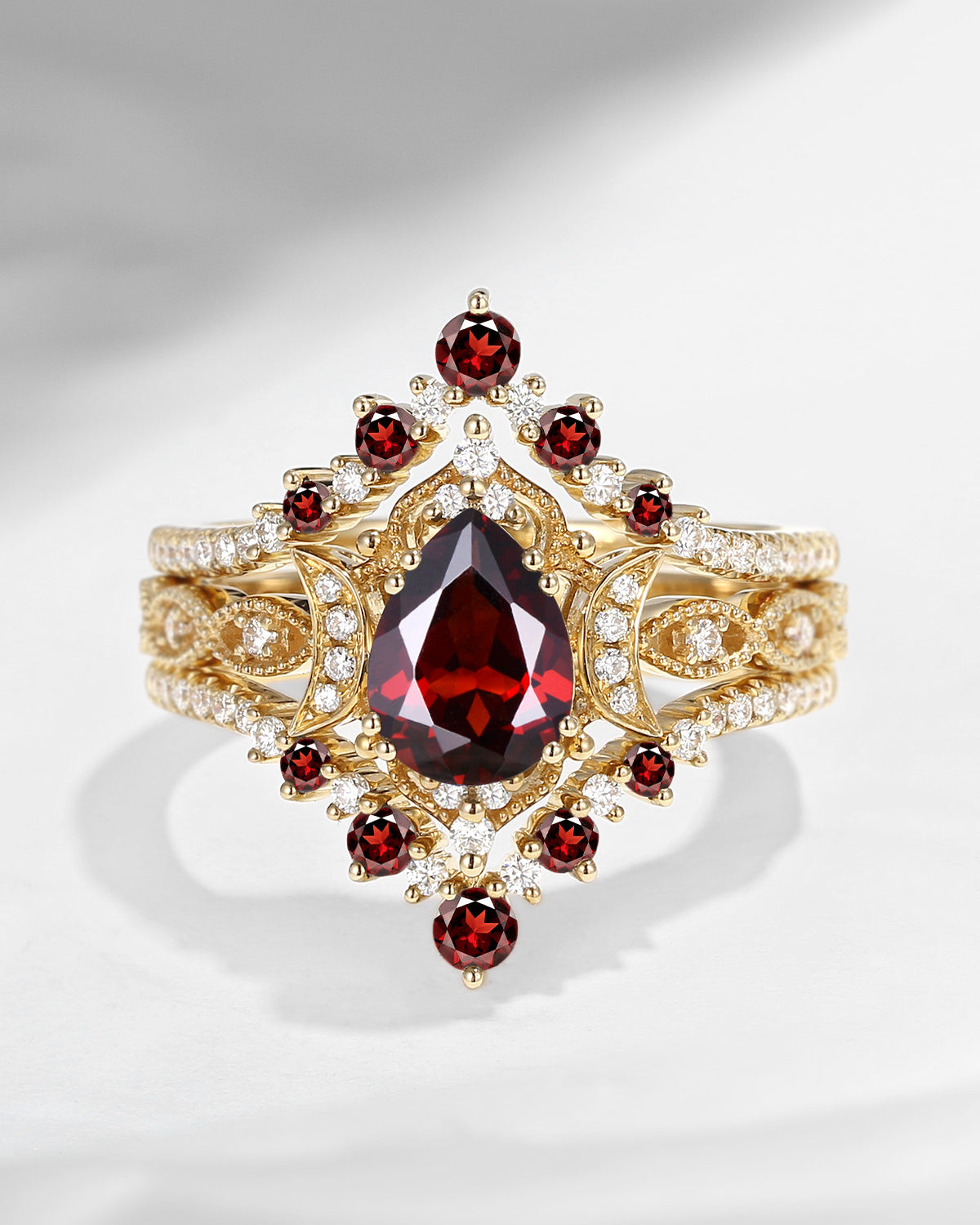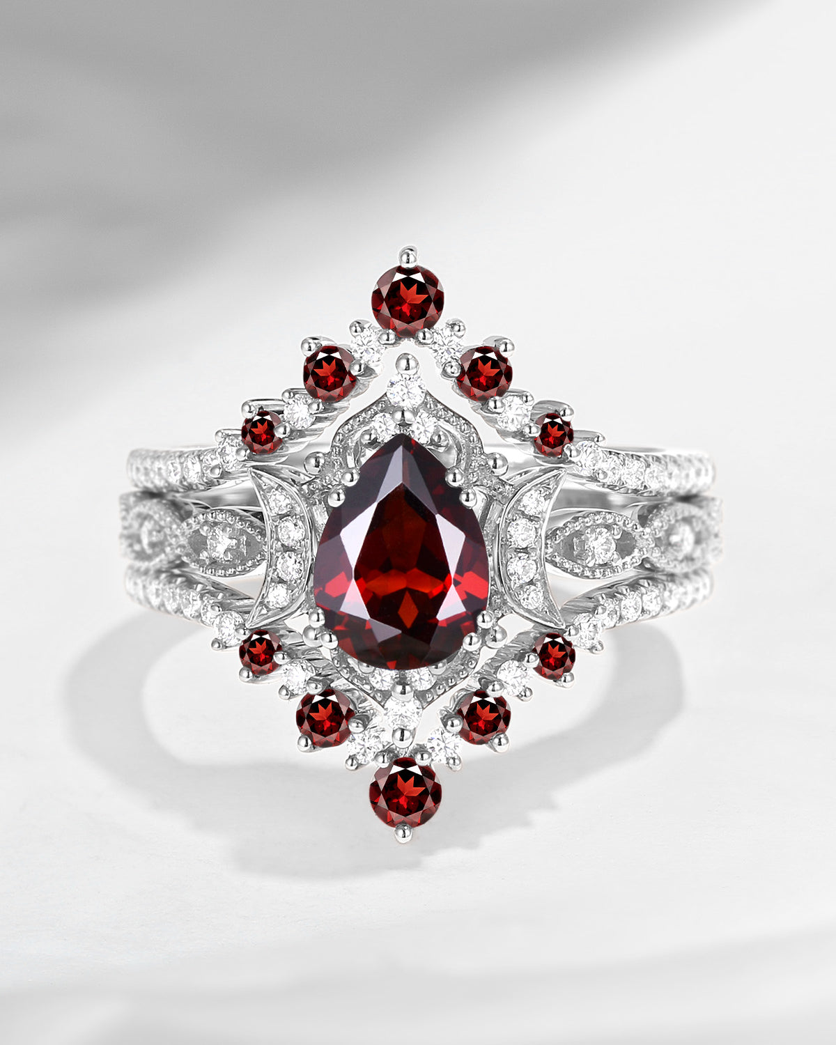 Crescent Moon | Unique Pear Cut Garnet Ring Bridal Set 3pcs