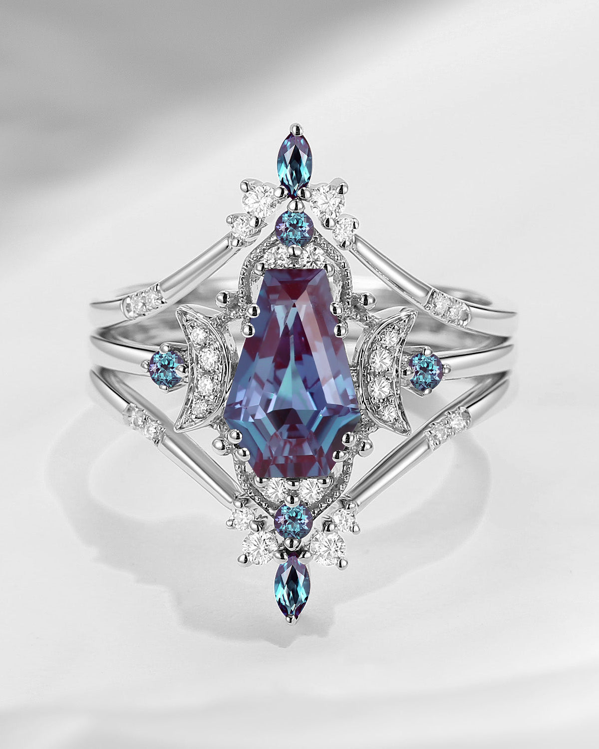 Crescent Moon | Vintage Style Pear Cut Lab Alexandrite Ring Set 3pcs