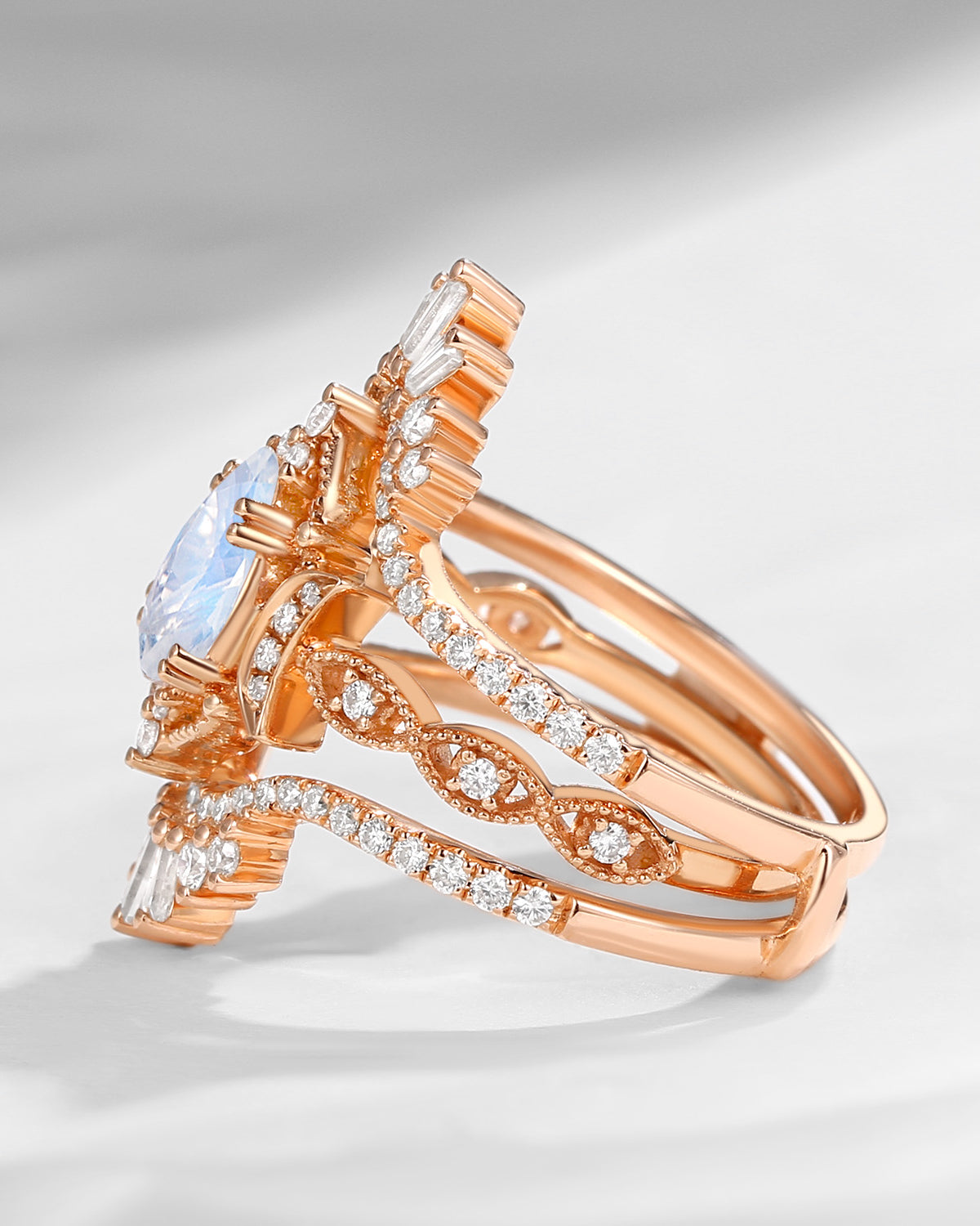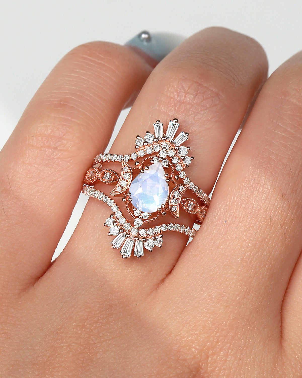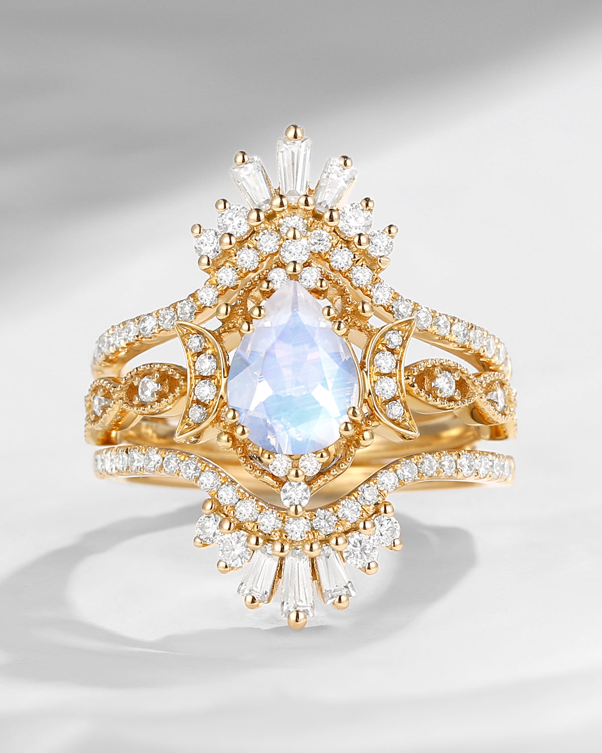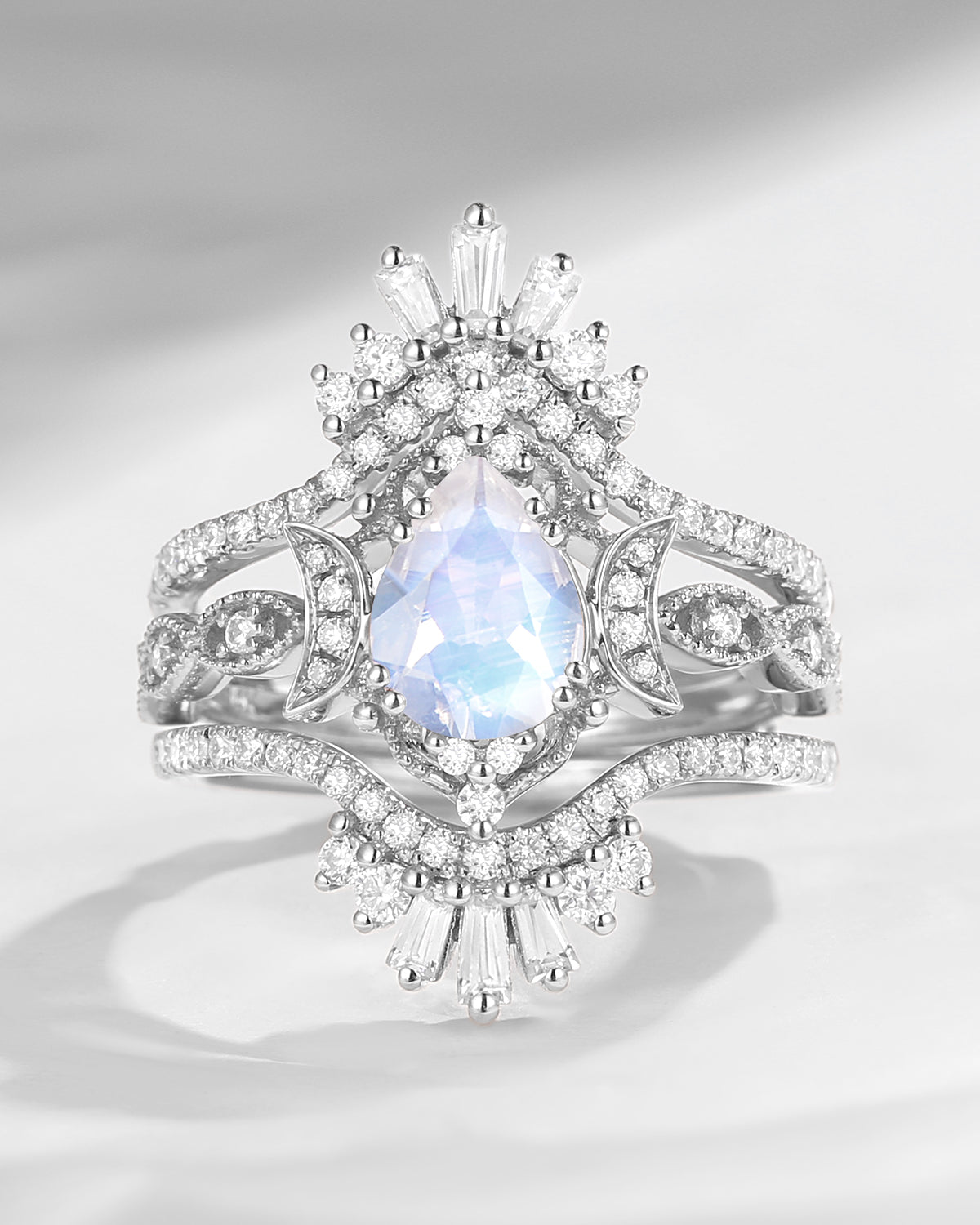Crescent Moon | Maximalist Style Pear Shaped Moonstone Engagement Ring 3pcs