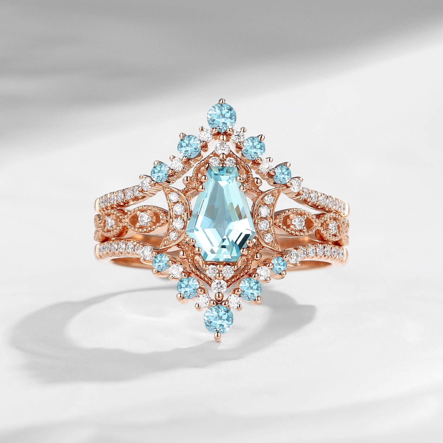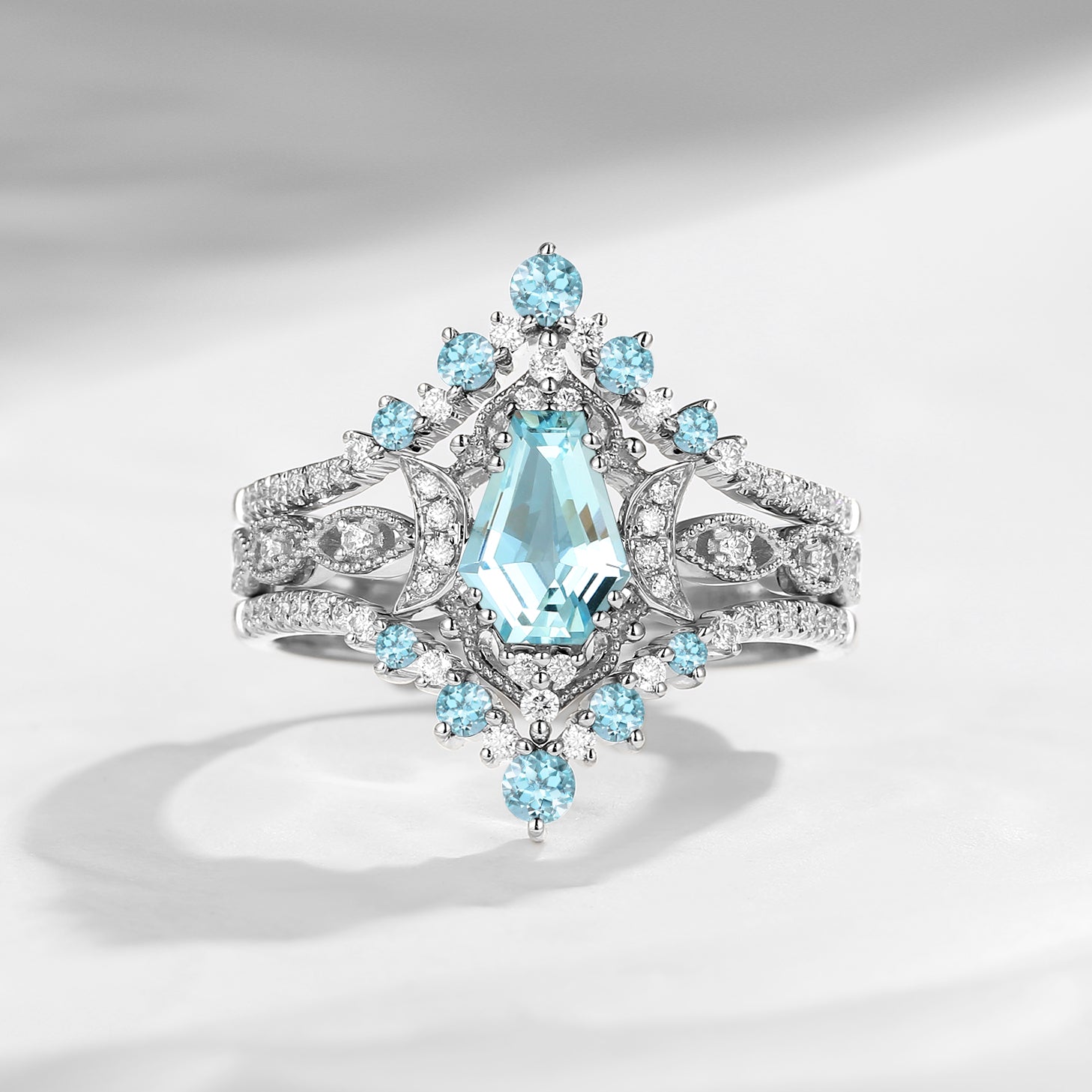 Nature Inspired Pear Cut Teal Moissanite Halo Engagement Ring Set 3pcs