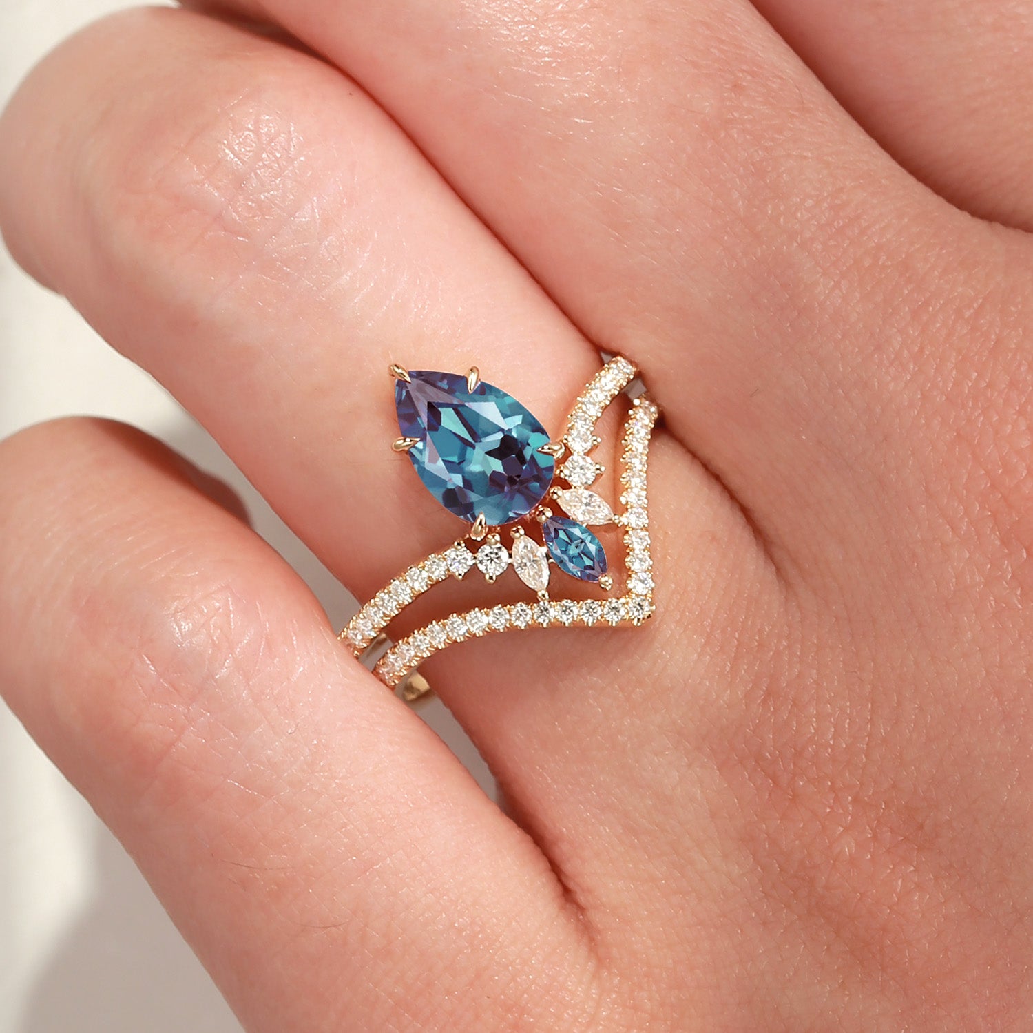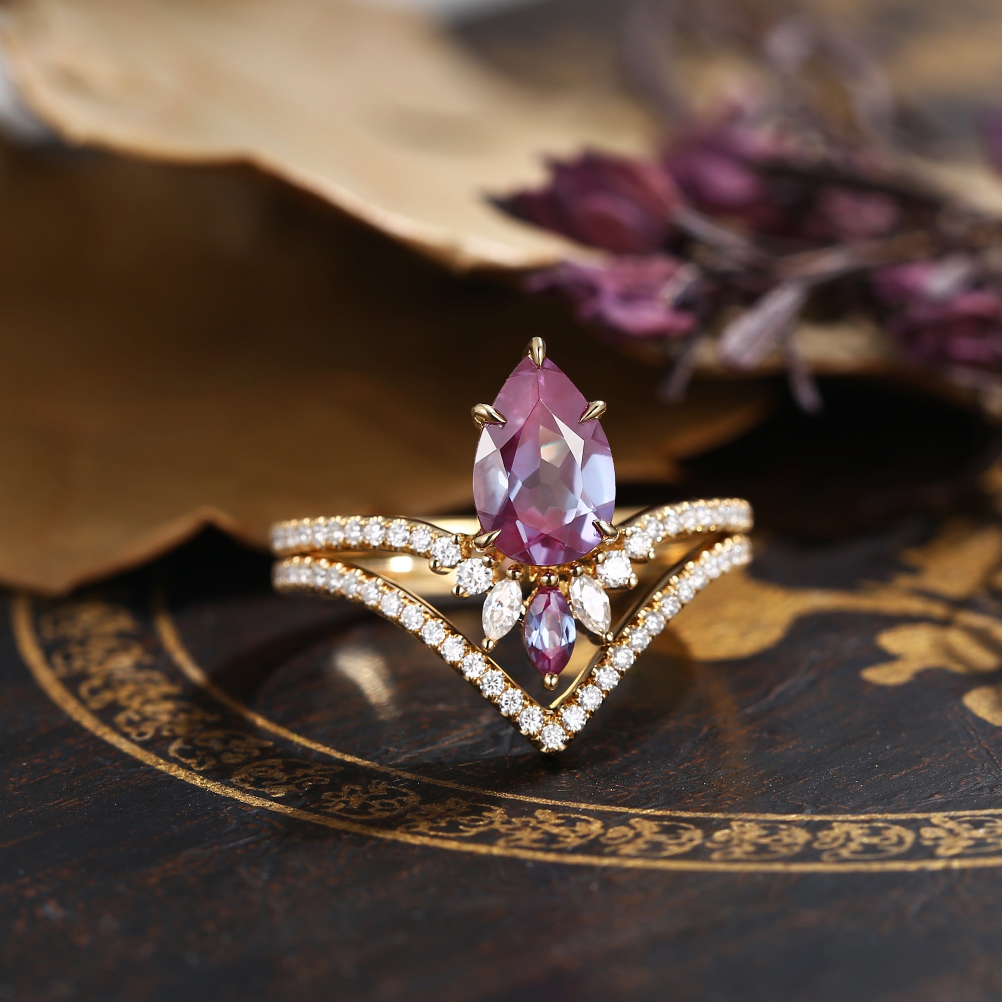 1.5ct Unique Lab Alexandrite Bridal Set 2pcs Pear Shaped Engagement Ring Marquise Cluster Flower Band Chevron Petal Birthstone Alexandrite Ring