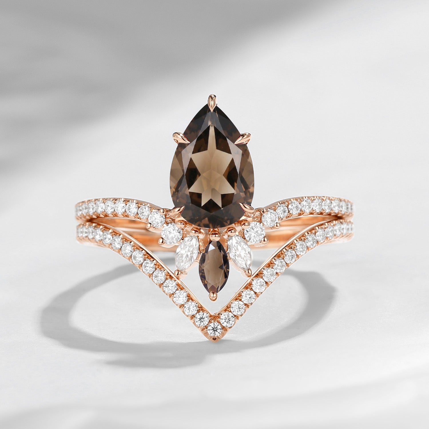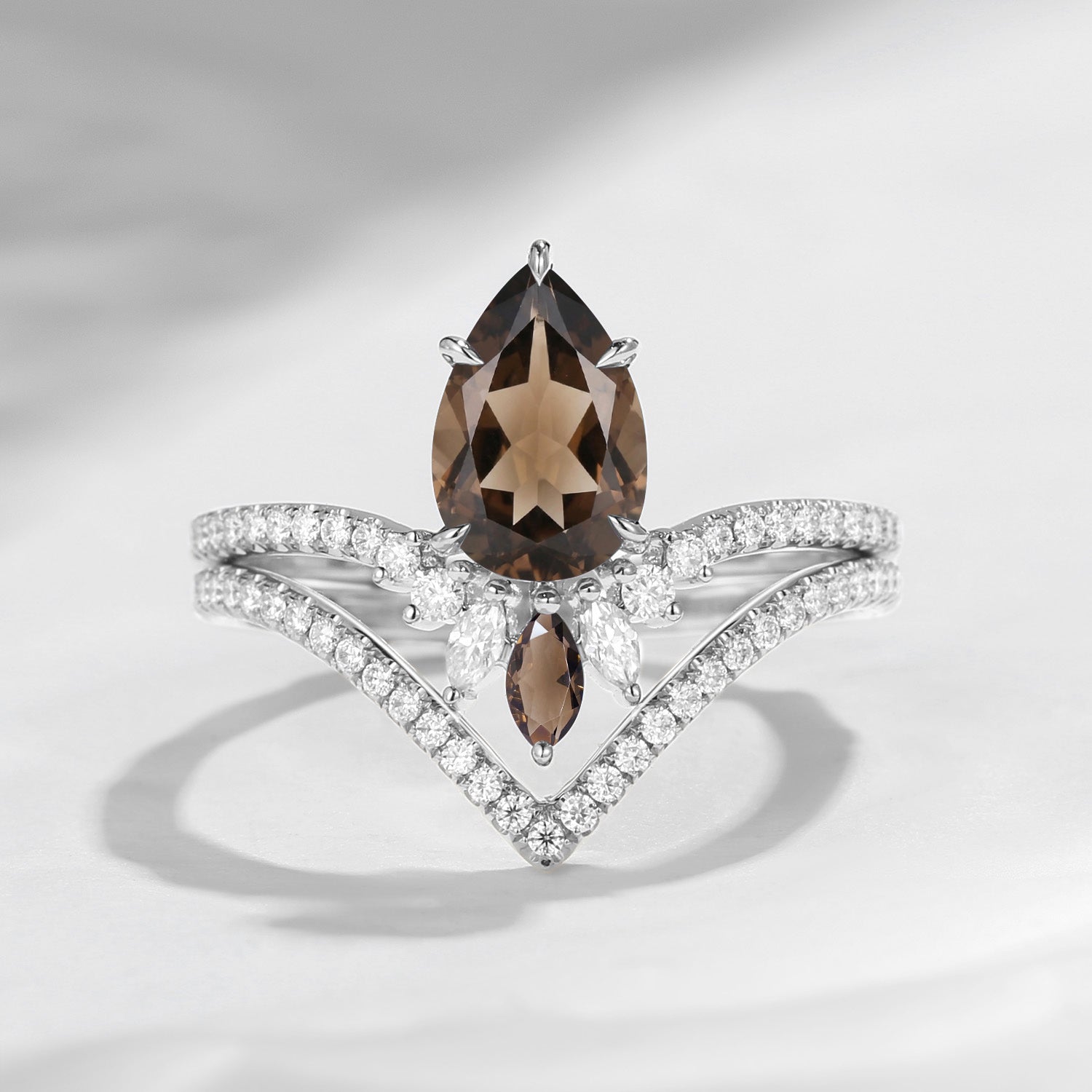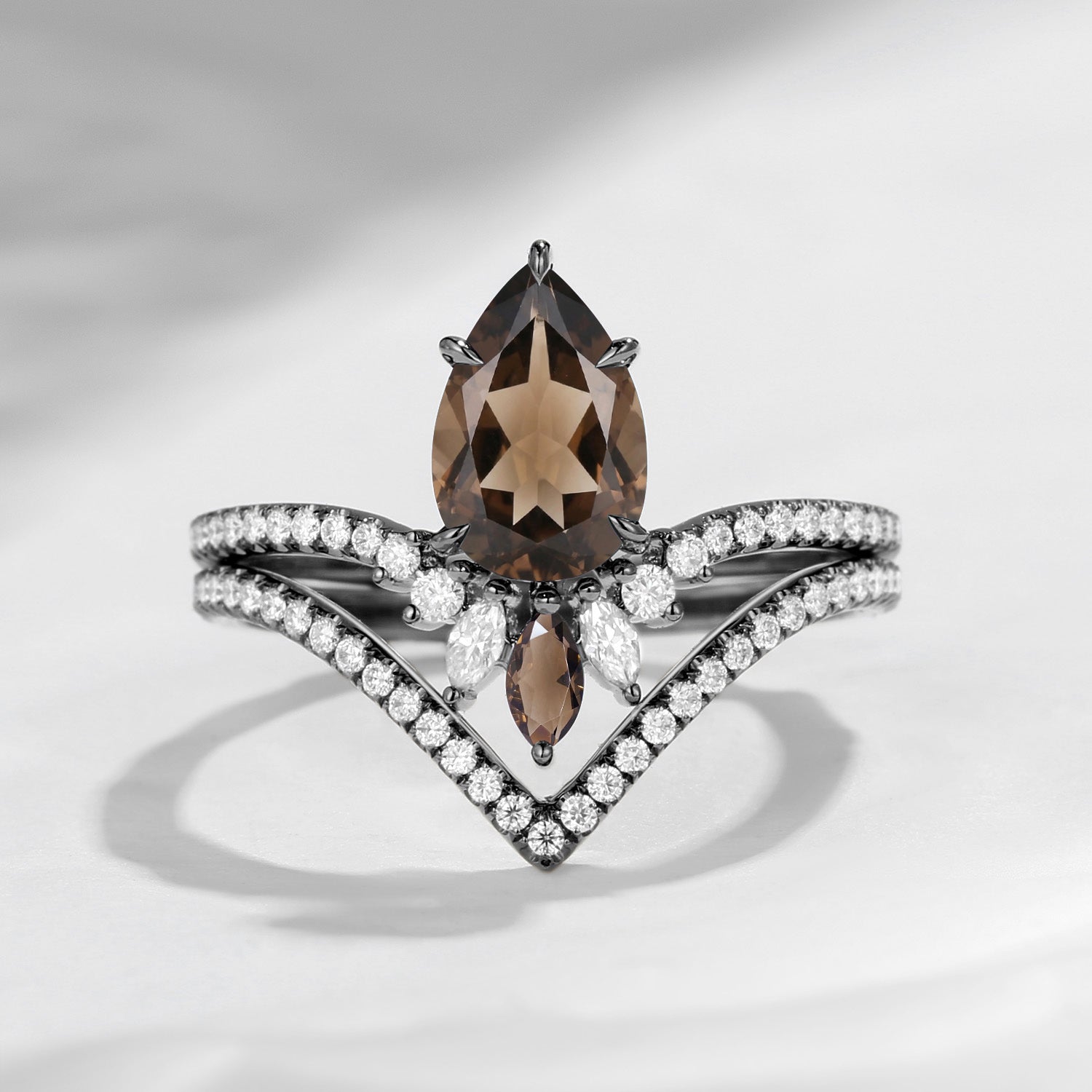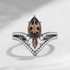 1.5ct Unique Smokey Quartz Bridal Set 2pcs Pear Shaped Engagement Ring Marquise Cluster Flower Band Chevron Petal Ring